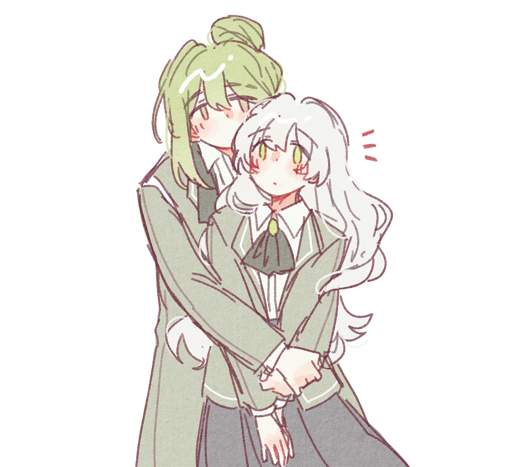 1boy 1girl ascot black_ascot black_skirt coat dress_shirt green_coat green_eyes green_hair green_jacket hair_bun hannah_(keicorporationz) hetero highres hug hug_from_behind jacket keicorporationz librarian_(project_moon) library_of_ruina long_hair netzach_(project_moon) nugget_(project_moon) oc_x_canon project_moon shirt simple_background single_hair_bun skirt white_background white_hair white_shirt