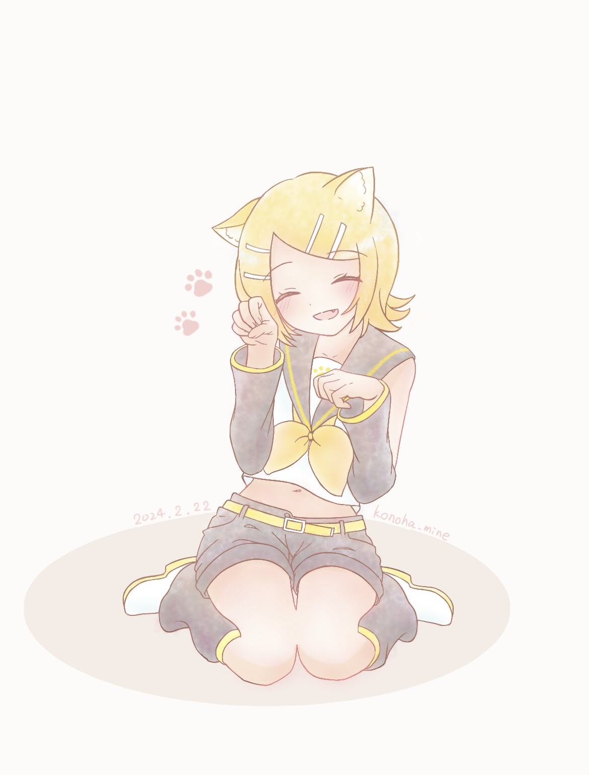 1girl animal_ears belt black_shorts blonde_hair blush cat_ears closed_eyes commentary_request dated detached_sleeves facing_viewer fang flat_chest gaiters hair_ornament hairclip highres kagamine_rin kemonomimi_mode knees konoha_mine light_blush midriff navel neckerchief open_mouth parallel_hairclips parted_bangs paw_pose paw_print paw_print_pattern sailor_collar shirt shoes short_hair short_shorts shorts signature simple_background sitting smile solo vocaloid wariza white_background white_shoes yellow_neckerchief