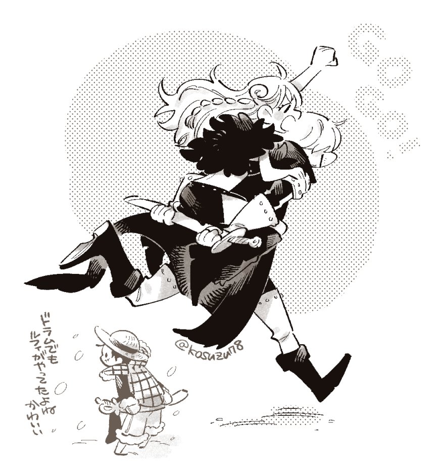 1girl 2boys arm_up boots capelet carrying commentary_request fur_capelet greyscale hat holding holding_sword holding_weapon long_hair mitsubachi_koucha monkey_d._luffy monochrome multiple_boys nami_(one_piece) nami_(one_piece)_(elbaf) one_piece piggyback sanji_(one_piece) straw_hat sword twitter_username weapon