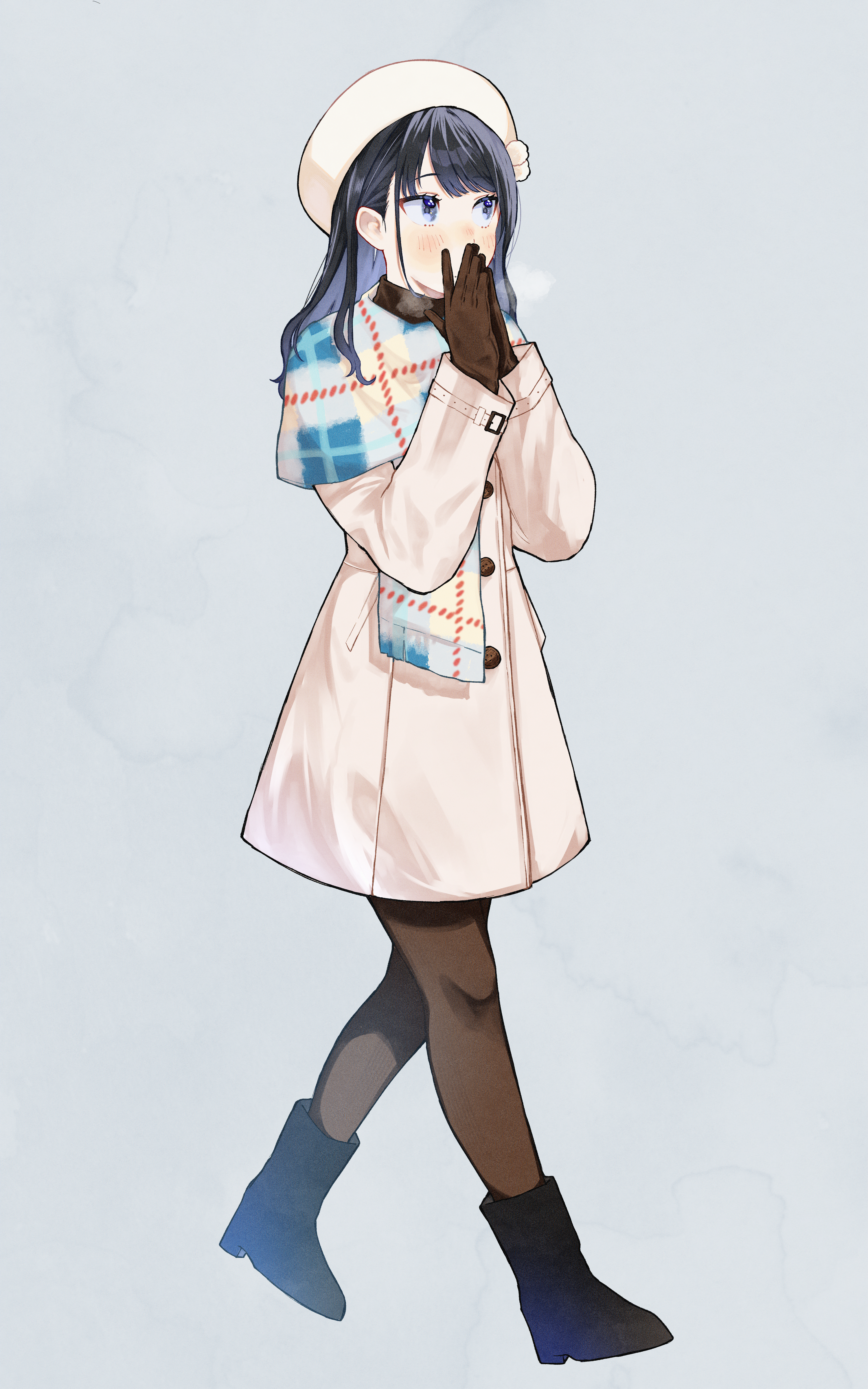 1girl 965ma_mogumogu absurdres beret black_boots black_hair black_shoes blue_background blue_scarf boots breath brown_gloves brown_pantyhose coat eyelashes full_body gloves grey_eyes hat highres idolmaster idolmaster_shiny_colors kazano_hiori light_blush long_hair long_sleeves own_hands_together pantyhose plaid_clothes plaid_scarf pom_pom_(clothes) scarf shoes simple_background solo swept_bangs turtleneck walking wavy_ends winter_clothes winter_coat