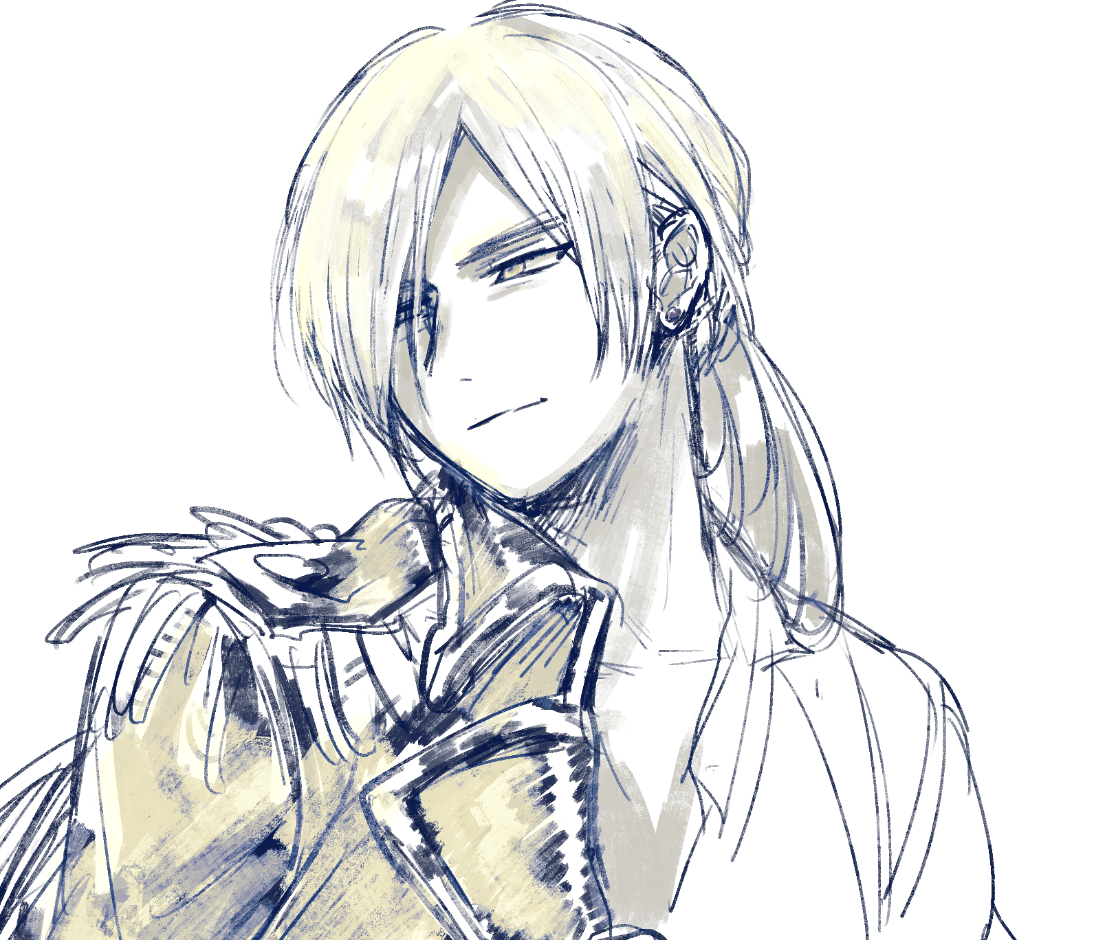 1boy closed_mouth collarbone commentary_request dragon_quest dragon_quest_xi earrings epaulettes floating_hair greyscale hair_over_one_eye highres homeros_(dq11) jacket jacket_partially_removed jewelry looking_to_the_side low_ponytail male_focus monochrome nomo96 ponytail sketch solo stud_earrings upper_body white_background