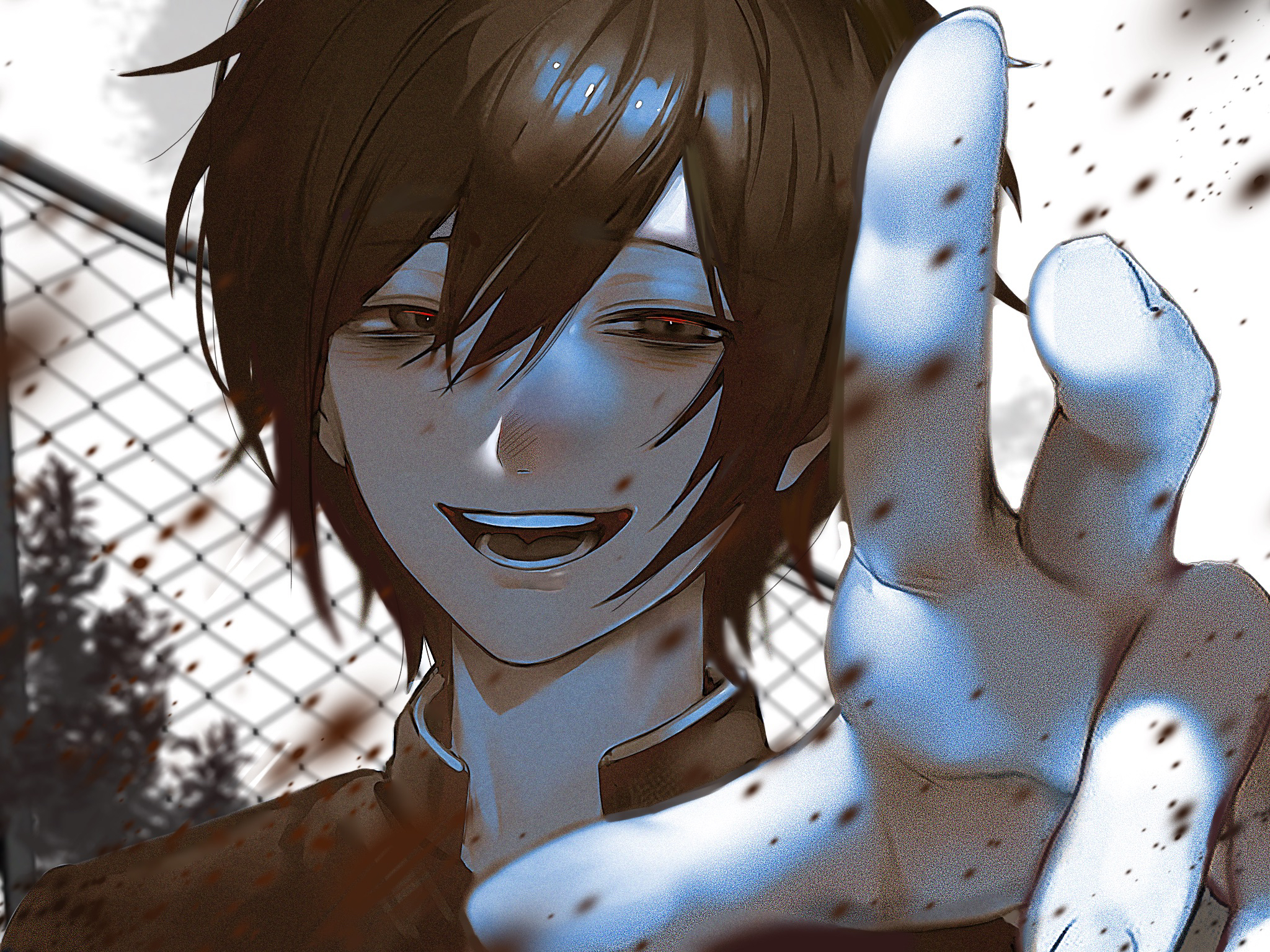 1boy black_hair black_jacket chain-link_fence fence gakuran highres jacket looking_at_viewer male_focus open_collar open_mouth outstretched_hand randal's_friends school_uniform short_hair smile solo supercap_aira teeth tsukada_satoru