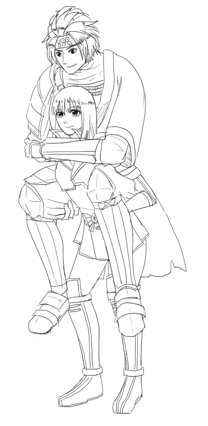 armor arms_around_neck carrying carrying_person protagonist_(sengoku_musou_chronicle) sanada_yukimura_(sengoku_musou) sengoku_musou sengoku_musou_chronicle sketch