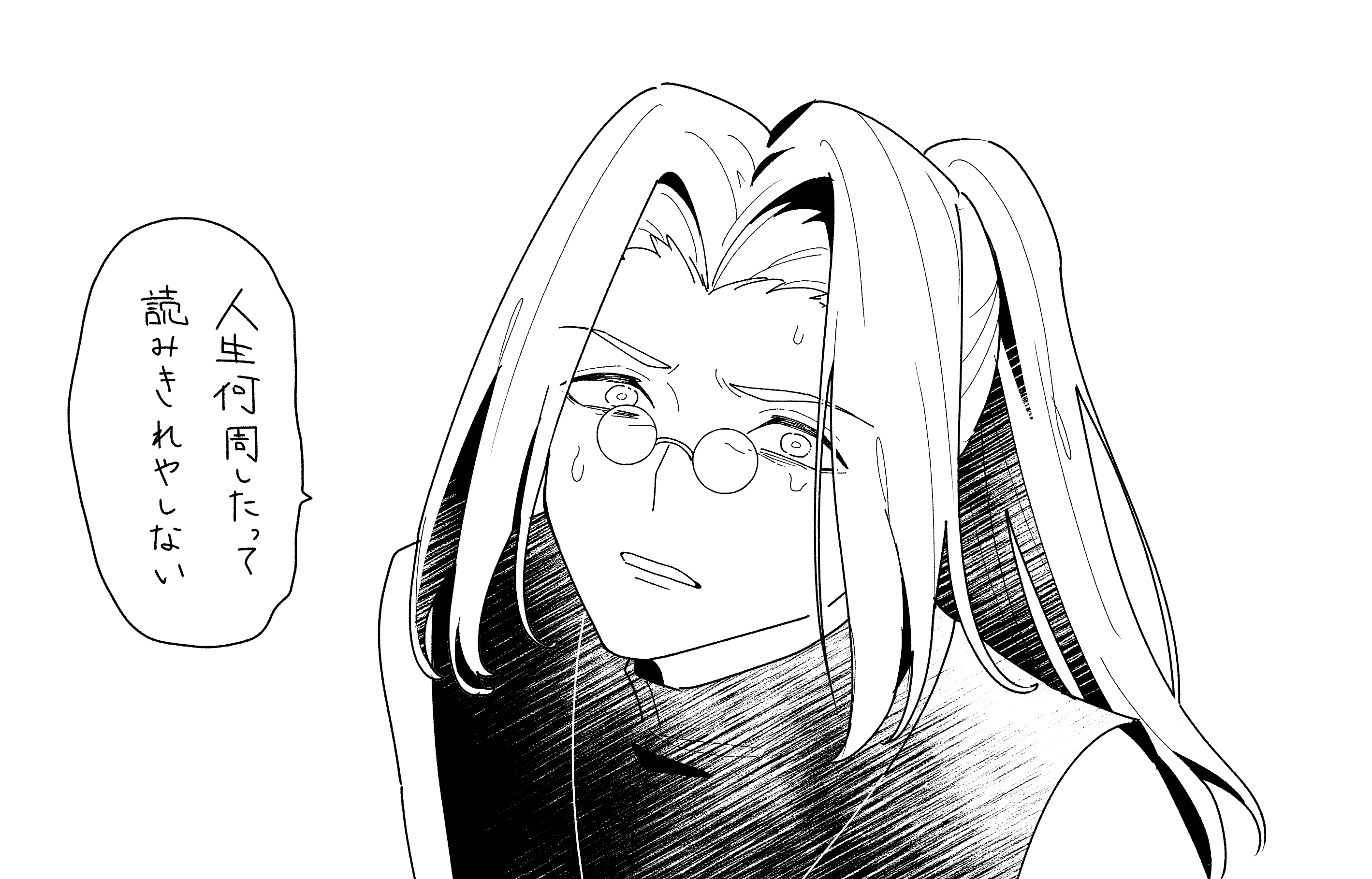 1boy cross cross_necklace glasses highres jewelry long_hair looking_at_viewer male_focus michael_roa_valdamjong michael_roa_valdamjong_(human) monochrome necklace ponytail priest sweat translation_request tsukihime upper_body worried yukinari_kakuri