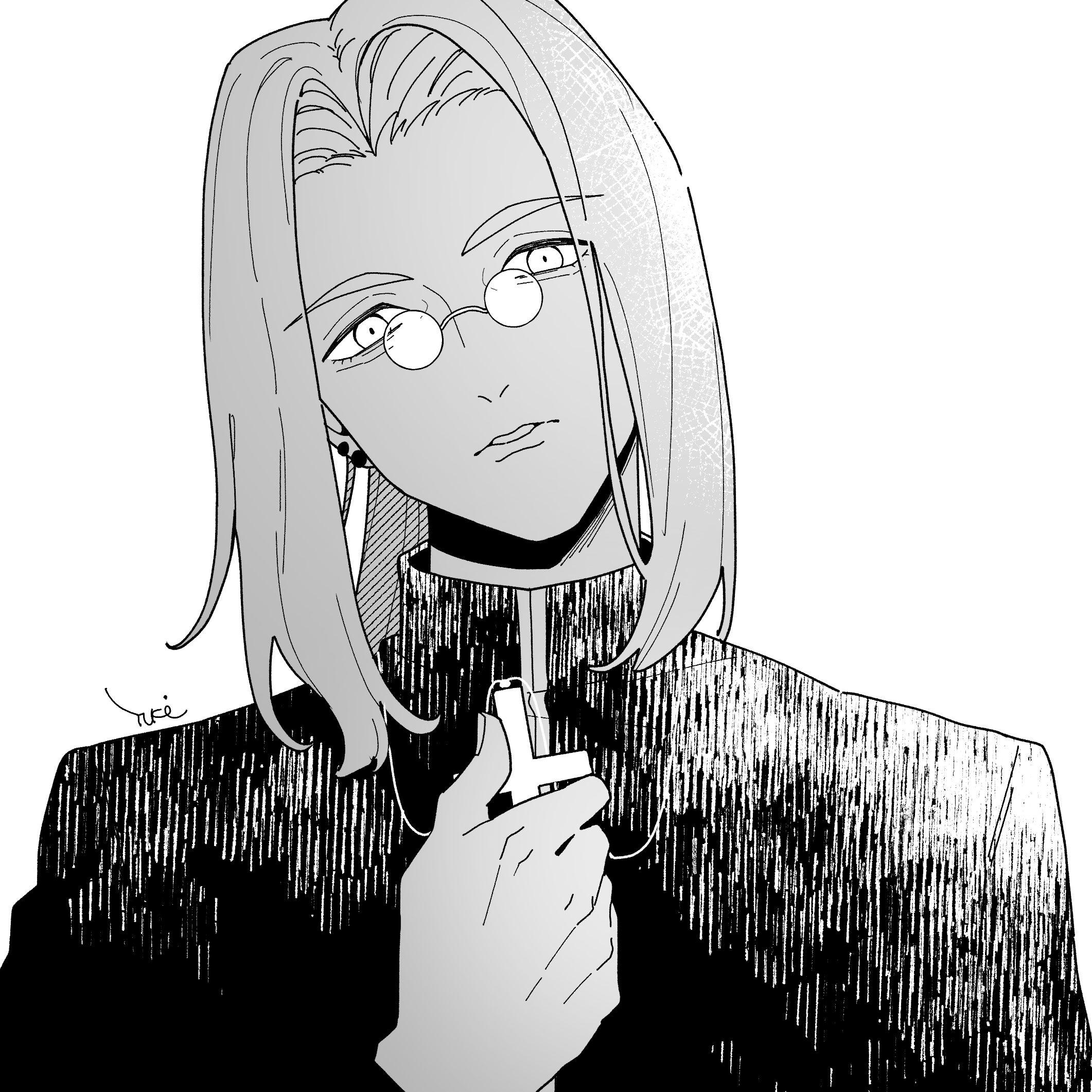 1boy cross cross_necklace glasses highres holding holding_cross jewelry long_hair looking_at_viewer male_focus michael_roa_valdamjong michael_roa_valdamjong_(human) monochrome necklace ponytail priest sweat tsukihime upper_body yukinari_kakuri