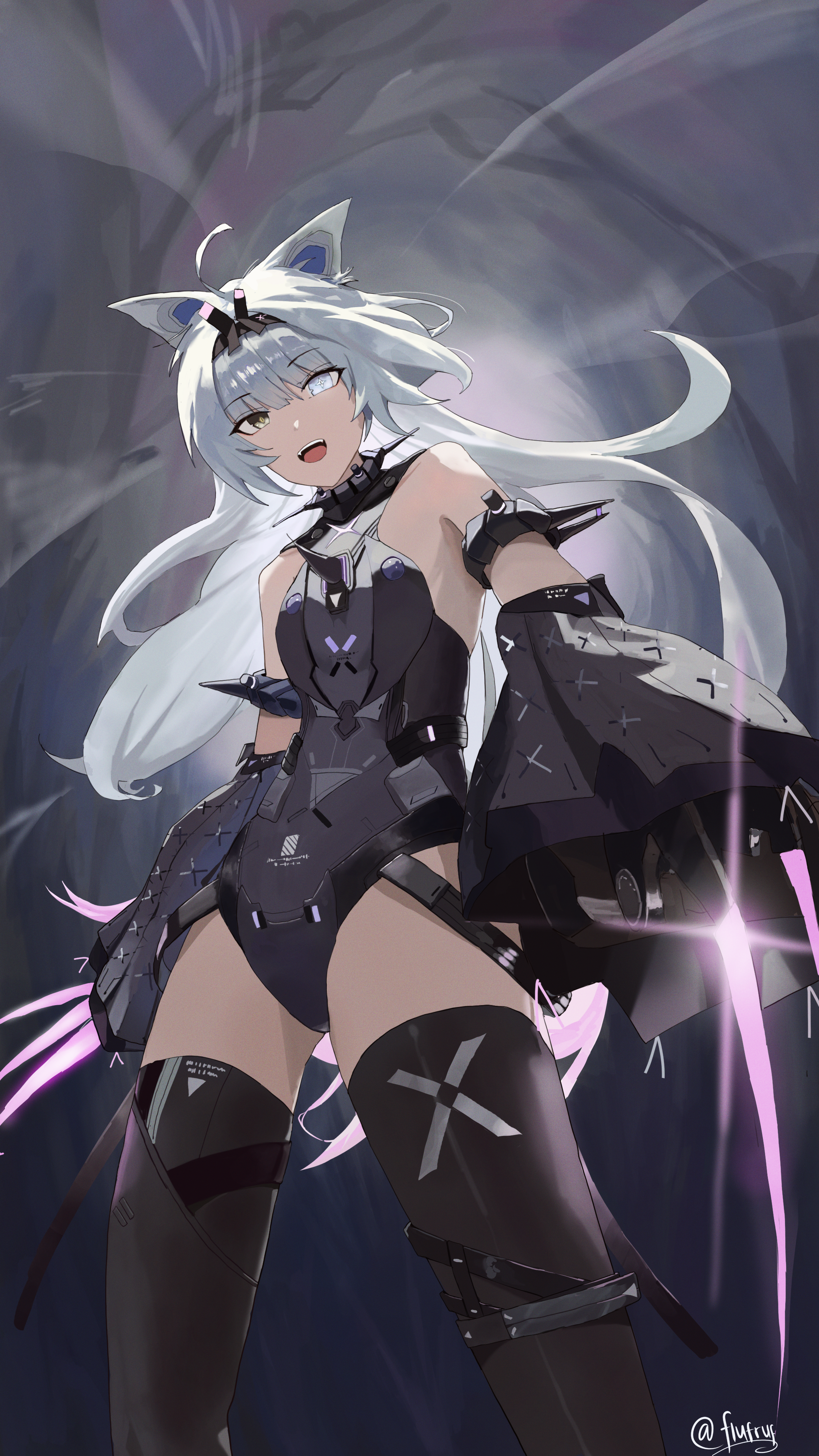 1girl absurdres ahoge animal_ears armlet bare_shoulders black_bodysuit black_hairband black_leotard black_sleeves black_thighhighs bodysuit claws commentary cross-shaped_pupils detached_sleeves fangs from_below grey_eyes grey_hair hair_intakes hairband heterochromia highres jewelry leotard long_hair mechanical_ears mismatched_pupils no._21:_feral_(pgr) no._21_(pgr) open_mouth punishing:_gray_raven sleeveless sleeveless_bodysuit sleeves_past_wrists sodacola solo spiked_armlet symbol-shaped_pupils teeth thighhighs upper_teeth_only wolf_ears yellow_eyes