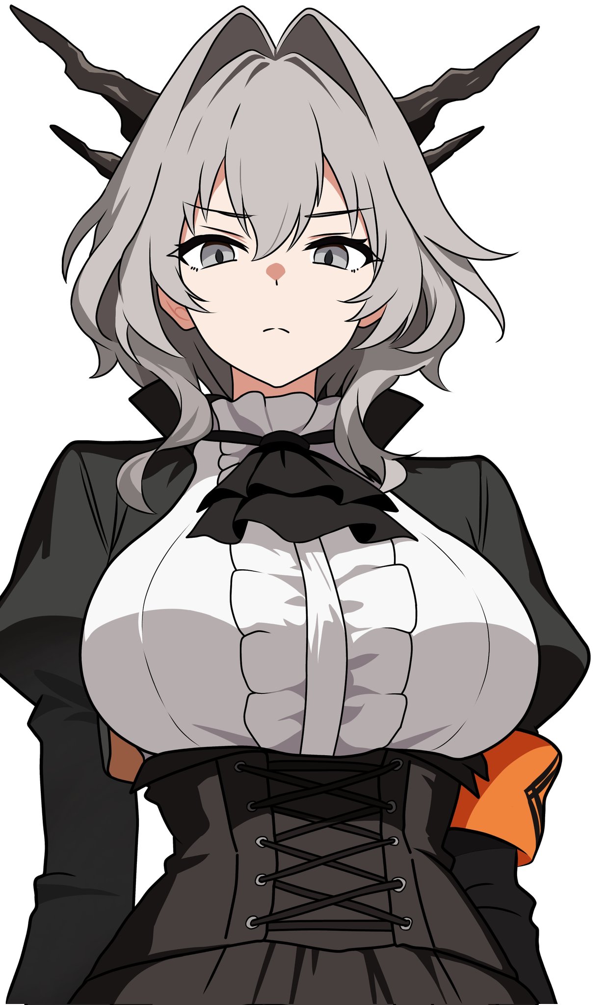 1girl anime_coloring arknights armband ascot black_ascot black_horns black_sleeves breasts center_frills closed_mouth commentary corset english_commentary frills grey_eyes grey_hair hair_between_eyes hair_intakes highres horns juliet_sleeves light_frown long_sleeves looking_at_viewer orange_armband puffy_sleeves shirt short_hair simple_background solo split_mouth staring talulah_(arknights) underbust white_background white_shirt witchrosemary