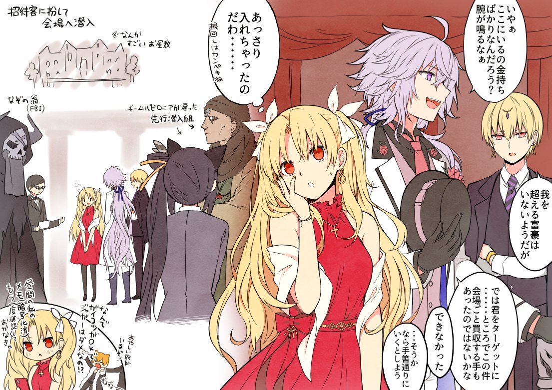 3girls 5boys animal_ears black_hair black_hood black_pantyhose black_robe black_sclera blonde_hair cellphone colored_sclera commentary_request domino_mask dress ereshkigal_(bitter_sweet)_(fate) ereshkigal_(fate) eye_mask facial_mark fate/grand_order fate_(series) forehead_mark fur_scarf gilgamesh gilgamesh_(caster)_(fate) gilgamesh_(fate) gilgamesh_(lawson_2020)_(fate) headscarf holding holding_paper holding_phone horns jaguarman_(fate) jaguarman_(third_ascension)_(fate) king_hassan_(fate) long_hair mask medium_dress merlin_(fate) merlin_(takarazuka_kinen)_(fate) multiple_boys multiple_girls musashibou_benkei_(fate) open_mouth orange_hair pantyhose paper phone ponytail purple_eyes purple_hair red_dress red_eyes robe short_hair side_ponytail smartphone tiger_ears translation_request tuxedo two_side_up ushiwakamaru_(fate) very_long_hair white_eyes yoyo_9ea
