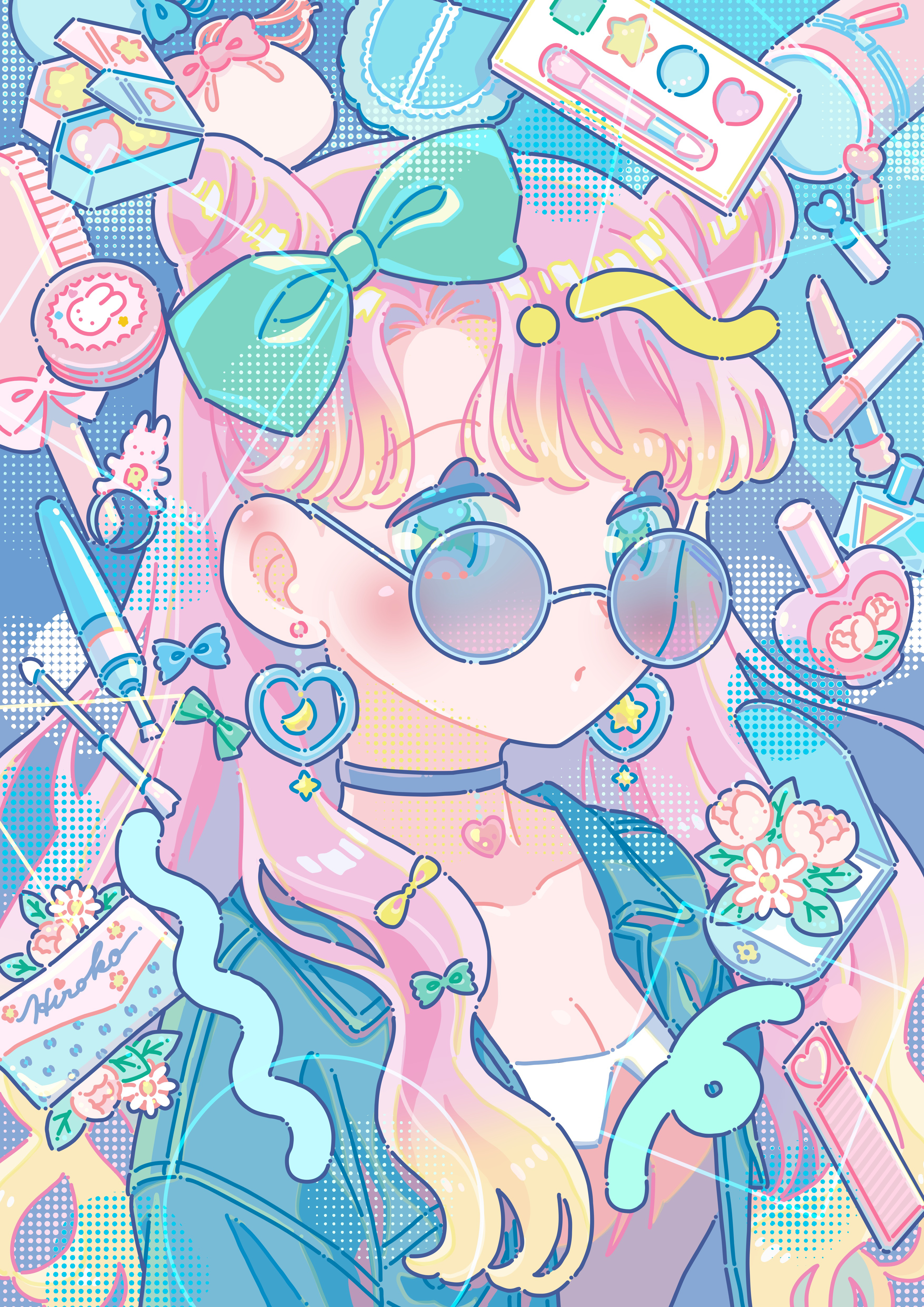 1girl absurdres aqua_bow blush bow breasts choker cleavage cone_hair_bun cosmetics earrings eyelashes flower green_eyes hair_bow hair_bun hair_ornament heart heisei_retro highres hiro046k jacket jewelry leaf lipstick long_hair looking_at_viewer makeup makeup_brush original parted_bangs pink_flower pink_hair round_eyewear screentones solo sunglasses upper_body
