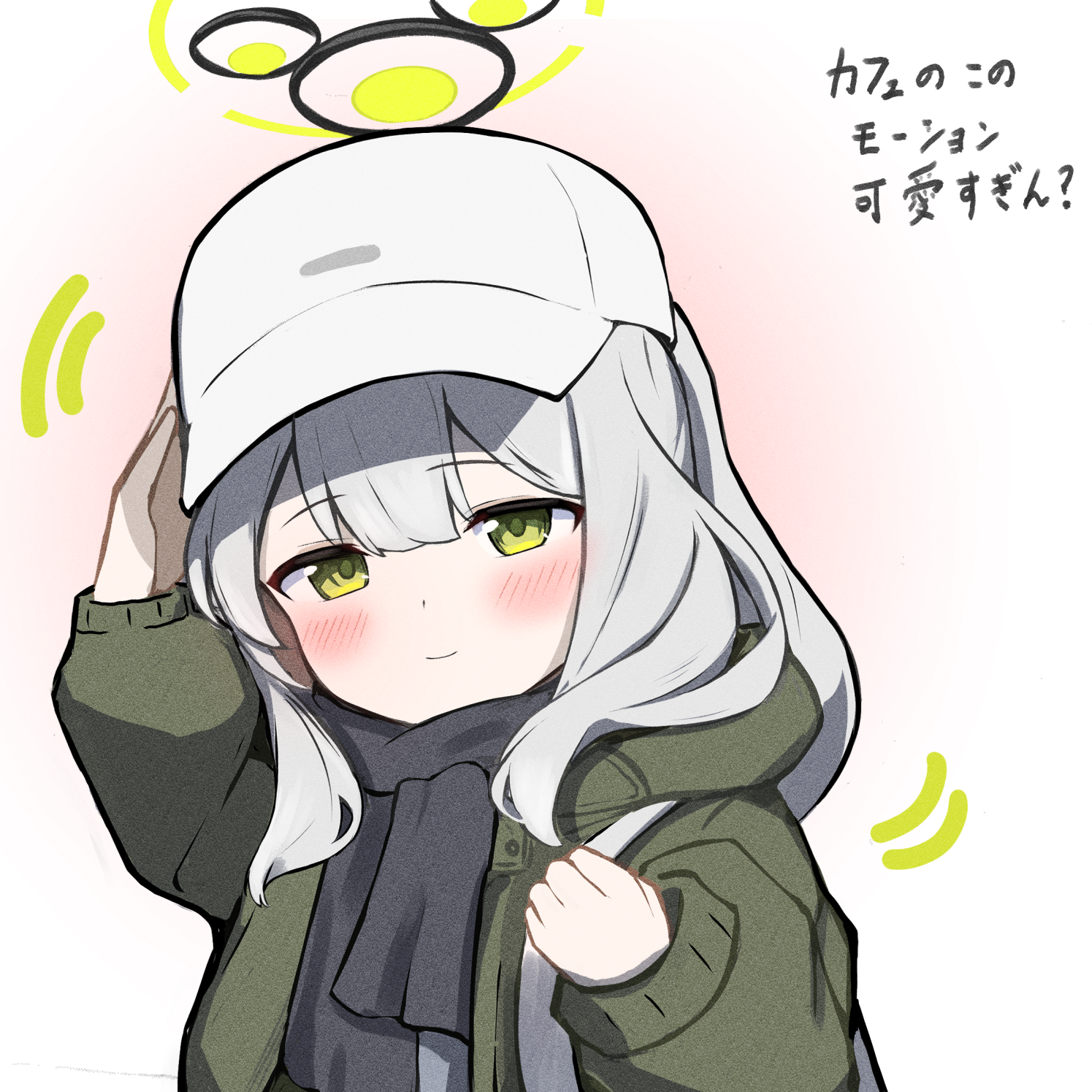 1girl adjusting_clothes adjusting_headwear black_scarf blue_archive blush bougashi green_eyes green_jacket grey_hair halo hare_(blue_archive) hare_(camp)_(blue_archive) hat highres jacket multicolored_halo scarf smile white_background white_hat