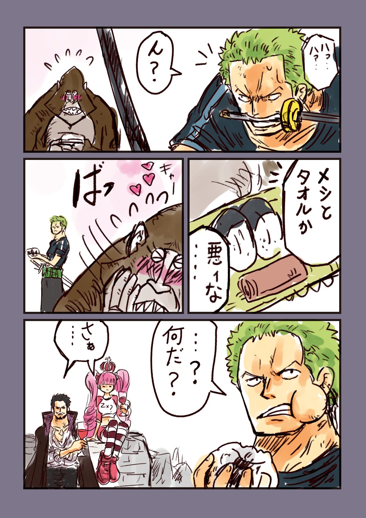 1girl 2boys black_hair blush commentary_request crown dracule_mihawk earrings food green_hair haramaki highres humandrill jewelry monkey multiple_boys nobuchi0503 one_piece onigiri pantyhose perona pink_hair roronoa_zoro sharp_teeth short_hair speech_bubble striped_clothes striped_pantyhose sweatdrop teeth translation_request twintails v-shaped_eyebrows weapon_in_mouth