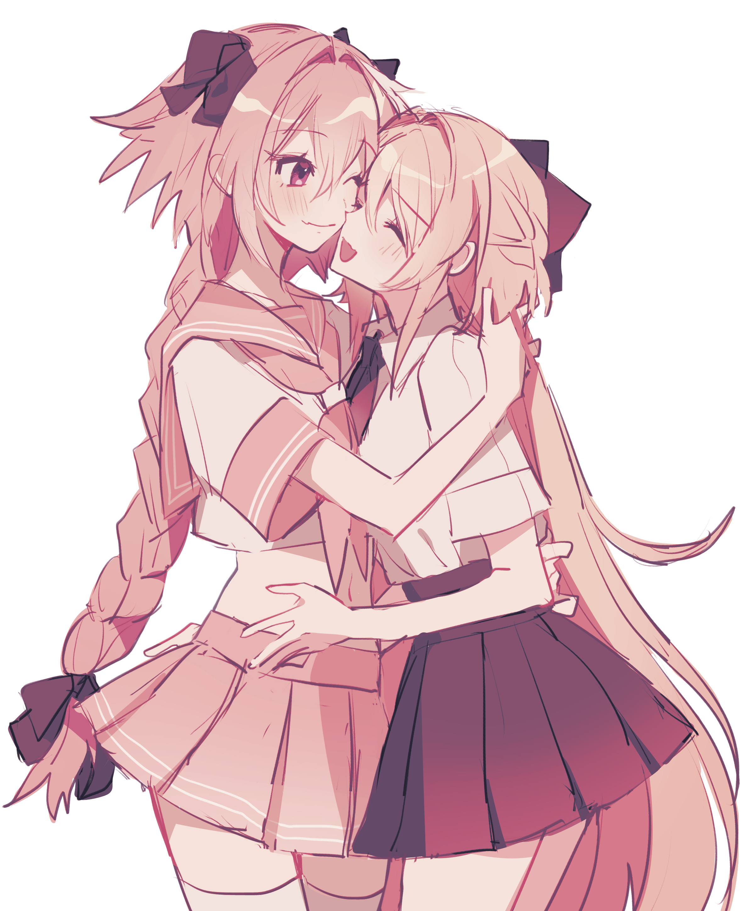 1boy 1girl absurdres astolfo_(fate) astolfo_(sailor_paladin)_(fate) blonde_hair bow braid closed_eyes couple fate/grand_order fate_(series) hair_bow hetero highres hug koyashaka liss_meier_(koyashaka) long_hair oc_x_canon official_alternate_costume one_eye_closed pink_hair skirt very_long_hair white_background