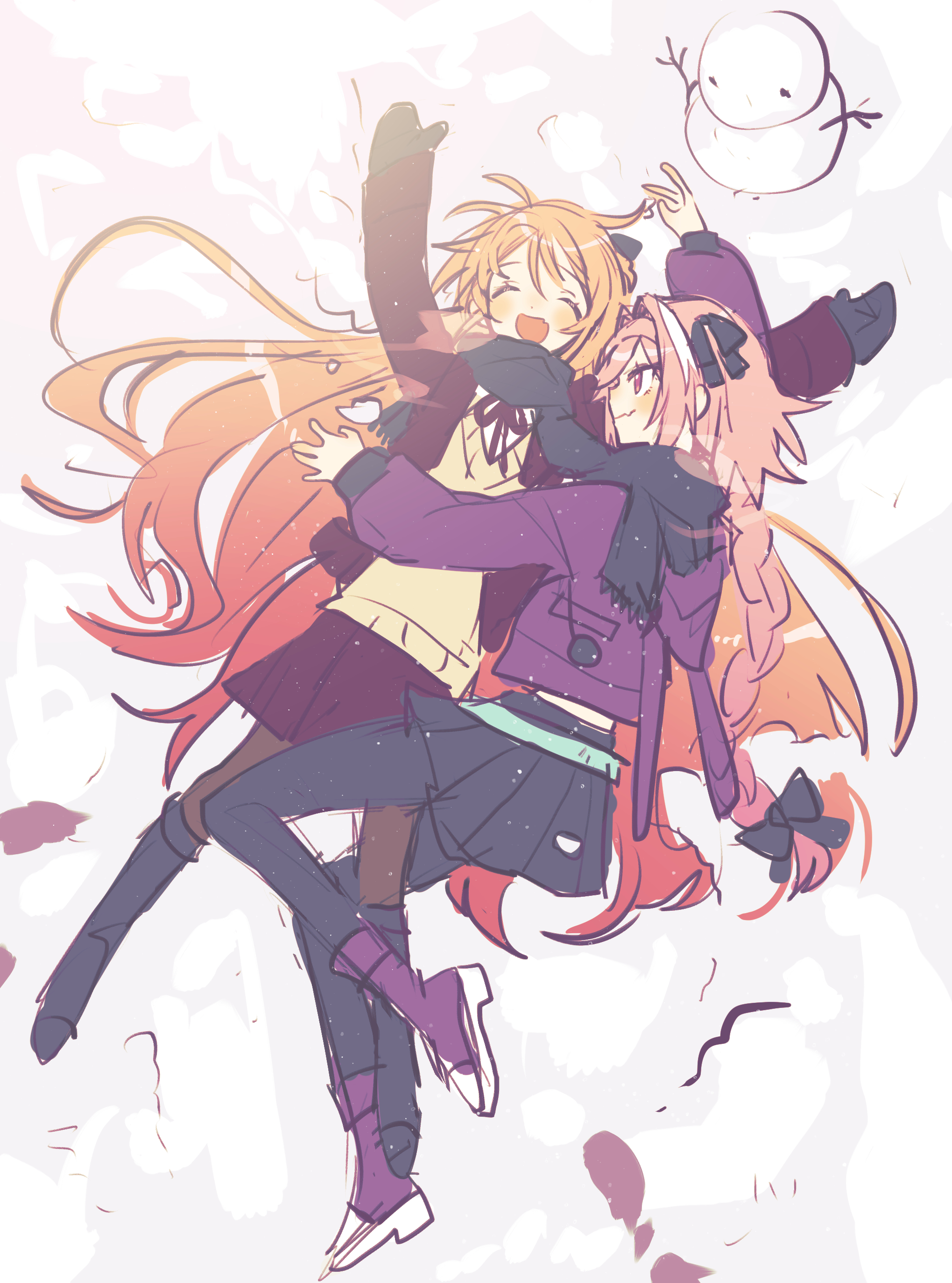 1boy 1girl absurdres astolfo_(fate) blonde_hair bow braid closed_eyes couple crossdressing crossdressing_(mtf) fate/grand_order fate_(series) hair_bow hetero highres hug koyashaka liss_meier_(koyashaka) long_hair lying oc_x_canon on_back on_side pink_hair scarf skirt smile snow snowman