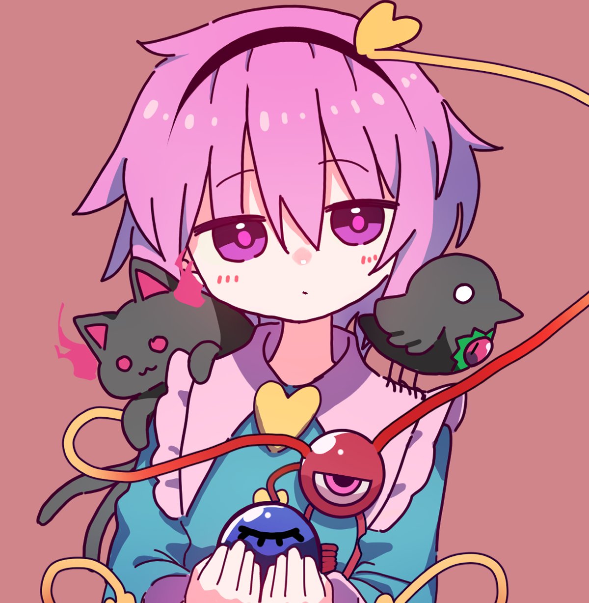 1girl bird black_hairband blue_shirt buttons cat closed_mouth eyeball hairband heart_button highres holding holding_eyeball kaenbyou_rin kaenbyou_rin_(cat) komeiji_satori looking_at_viewer pink_background pink_eyes reiuji_utsuho shikemoku shirt simple_background solo third_eye touhou upper_body white_eyes