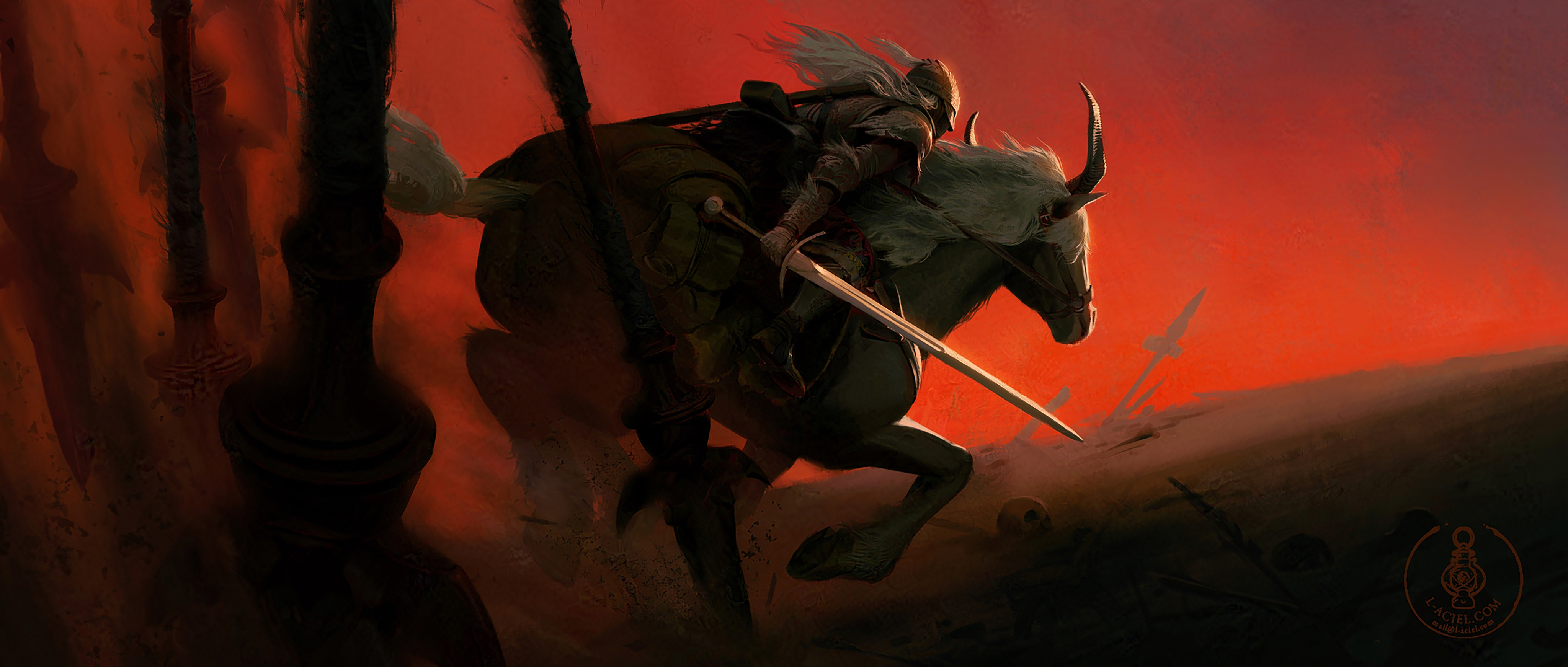 1other absurdres ambiguous_gender armor battlefield cloak commentary elden_ring english_commentary full_armor fur_cloak helm helmet highres holding holding_sword holding_weapon horns horse horseback_riding l_aciel leaning_forward long_hair outdoors planted planted_sword planted_weapon red_sky reins riding saddle saddlebags sky sword tarnished_(elden_ring) torrent_(elden_ring) weapon white_hair