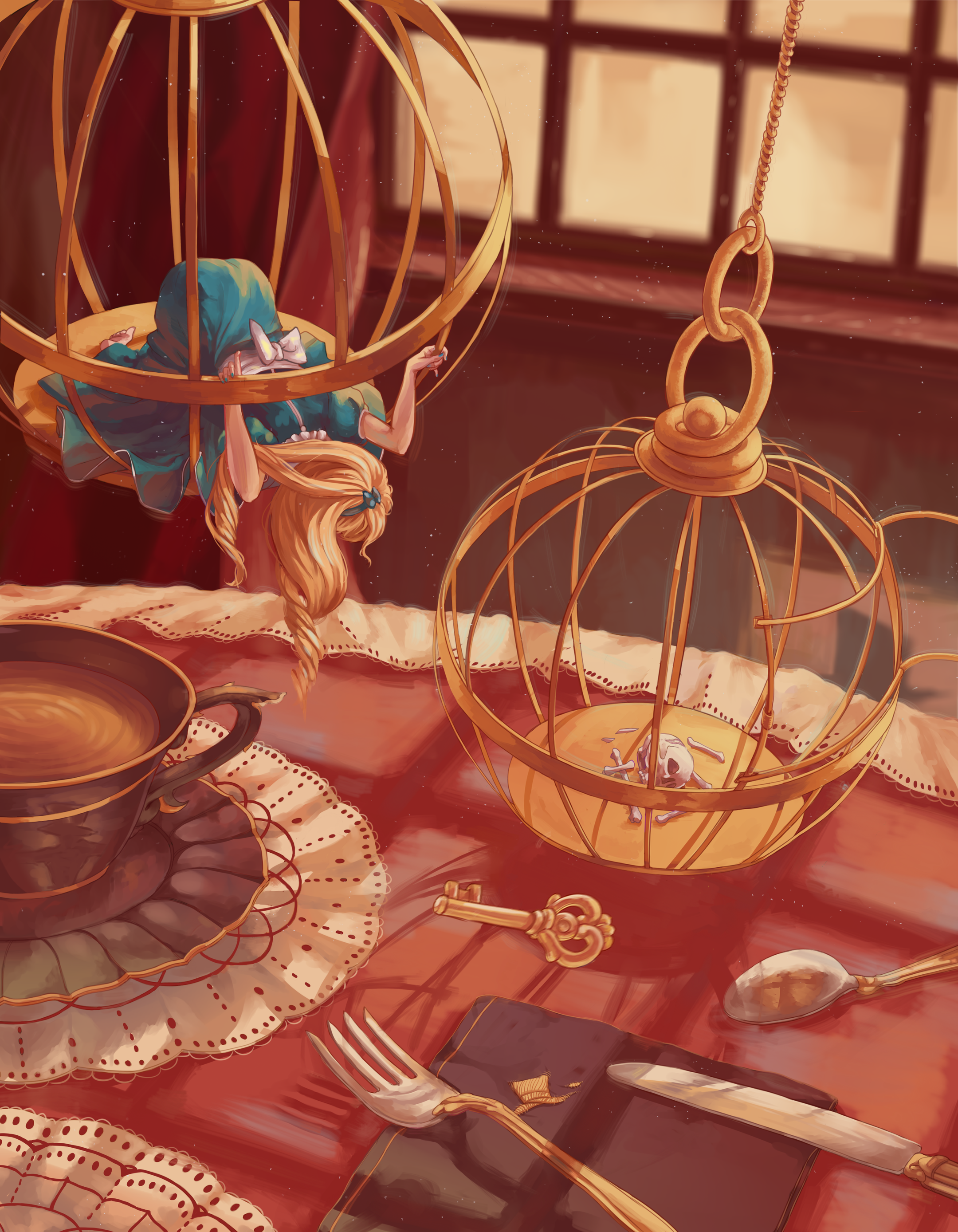 1girl absurdres alice_(alice_in_wonderland) alice's_adventures_in_wonderland all_fours back_bow blonde_hair blue_bow blue_dress bone book bow cage commentary cup dining_room dress drill_hair english_commentary fork frilled_dress frills full_body hair_bow highres in_cage indoors ippomoea key knife leaning_forward long_dress long_hair mini_person minigirl puffy_short_sleeves puffy_sleeves saucer shade short_sleeves skull solo sponge sunset tea teacup very_long_hair white_bow window