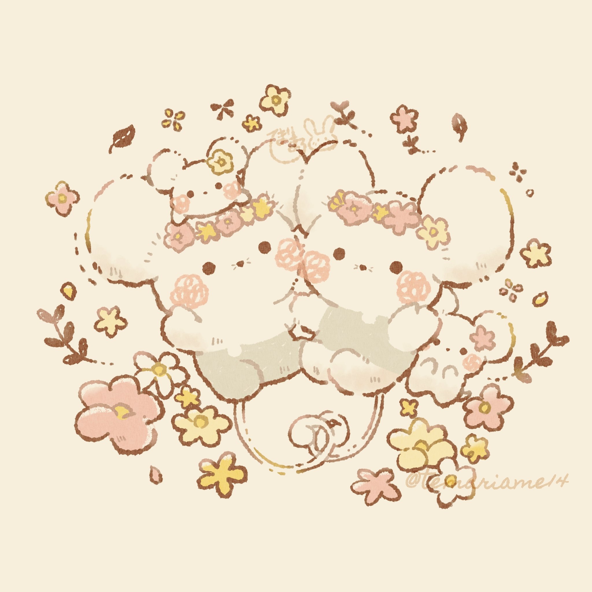 blush_stickers brown_background commentary_request flower flower_wreath full_body hair_flower hair_ornament highres looking_at_viewer maushold maushold_(family_of_four) nintendo no_humans pink_flower pokemon pokemon_(creature) pokemon_focus signature simple_background temariame14 twitter_username white_flower yellow_flower