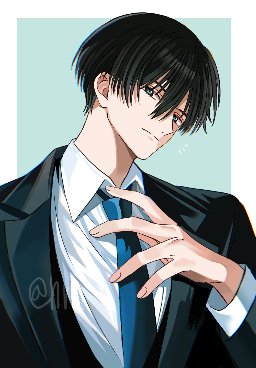 1boy aqua_eyes black_hair black_jacket black_suit blue_lock blue_necktie closed_mouth formal_clothes hair_between_eyes highres hyohls2_(hamao3o) itoshi_rin jacket male_focus necktie shirt short_hair simple_background solo suit white_shirt