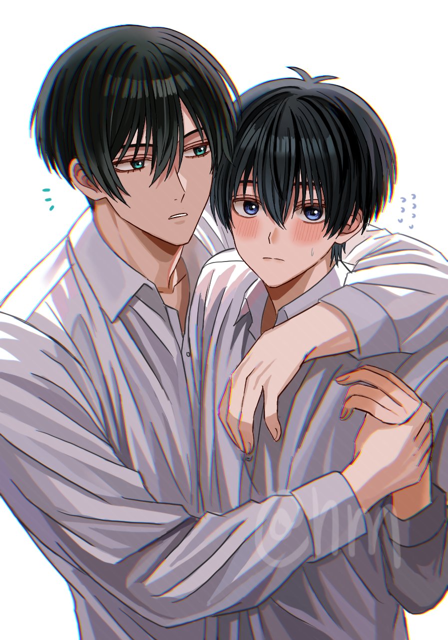 2boys aqua_eyes black_hair blue_eyes blue_lock blush hair_between_eyes highres hyohls2_(hamao3o) isagi_yoichi itoshi_rin long_sleeves looking_at_viewer male_focus multiple_boys shirt short_hair white_background white_shirt yaoi