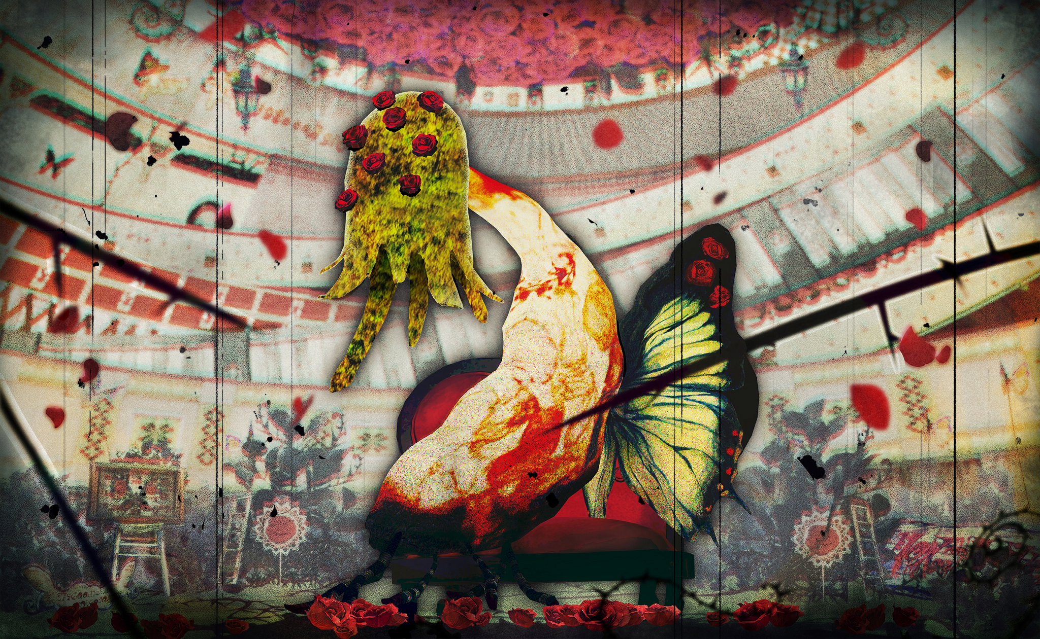 abstract_background artist_request butterfly_wings couch creature creature_focus easel falling_petals film_grain flower game_cg gertrud_(madoka_magica) highres insect_wings lantern mahou_shoujo_madoka_magica mahou_shoujo_madoka_magica_magia_exedra no_humans official_art painting_(object) petals picture_frame red_flower red_rose rose solo thorns wings witch's_labyrinth witch_(madoka_magica)