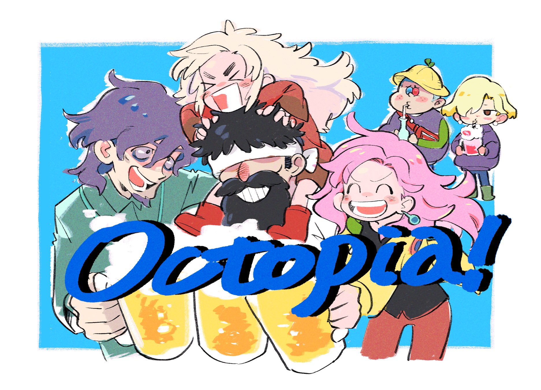 >_< 3boys 3girls ^_^ alcohol alternate_costume alva_(eastward) aqua_shirt arm_around_back bags_under_eyes beard beer beer_mug black_eyes black_hair black_shirt blonde_hair blue_background blue_eyes blue_hair blue_pants blush_stickers boots border breasts brown_eyes casual character_request child closed_eyes collared_shirt commentary_request cup drink drinking_straw earrings eastward english_text facial_hair fanny_pack floating_clothes floating_hair goat green_boots green_shirt grin hair_between_eyes hair_over_eyes hair_over_one_eye happy hat headband heterochromia highres holding holding_drink isabel_(eastward) jacket jewelry john_(eastward) long_hair looking_at_another messy_hair milkshake mug multiple_boys multiple_girls mustache no+bi= open_clothes open_jacket open_mouth outline outside_border oversized_sweater pants pink_hair purple_hair purple_jacket purple_vest red_bag red_boots red_eyes red_pants red_sweater sam_(eastward) shirt short_hair sideboob sitting_on_shoulder sleeves_past_wrists smile solid_oval_eyes sphere_earrings sweater teeth thick_eyebrows v-shaped_eyebrows very_long_hair vest white_border white_hair white_headband white_outline white_shirt wide-eyed yellow_hat yellow_jacket