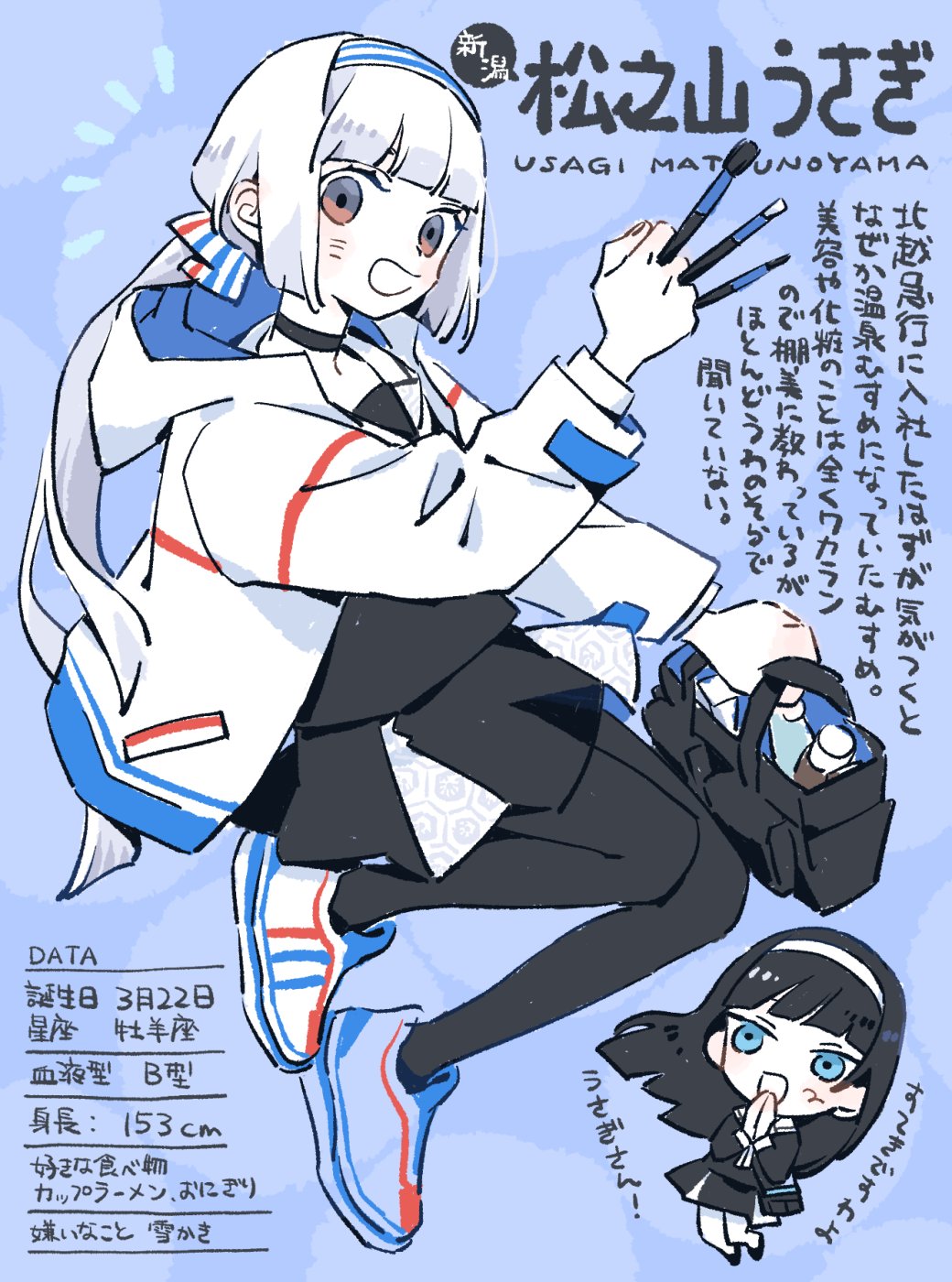 2girls asahi_(uwa) bag between_fingers black_choker black_hair black_pantyhose black_serafuku black_shirt black_skirt blue_background blue_hairband blunt_bangs character_name character_profile chibi chibi_inset choker cosplay crossover full_body hairband highres holding holding_bag holding_brush holding_makeup_brush hood hood_down hooded_jacket jacket long_hair long_sleeves looking_at_another looking_at_viewer looking_to_the_side low_ponytail makeup_brush matching_outfits matsudai_usagi matsunoyama_tanami matsunoyama_tanami_(cosplay) multiple_girls onsen_musume palms_together pantyhose polka_dot polka_dot_background ponytail school_uniform serafuku shirt shoes skirt smile sneakers tetsudou_musume translation_request white_hair white_hairband white_jacket