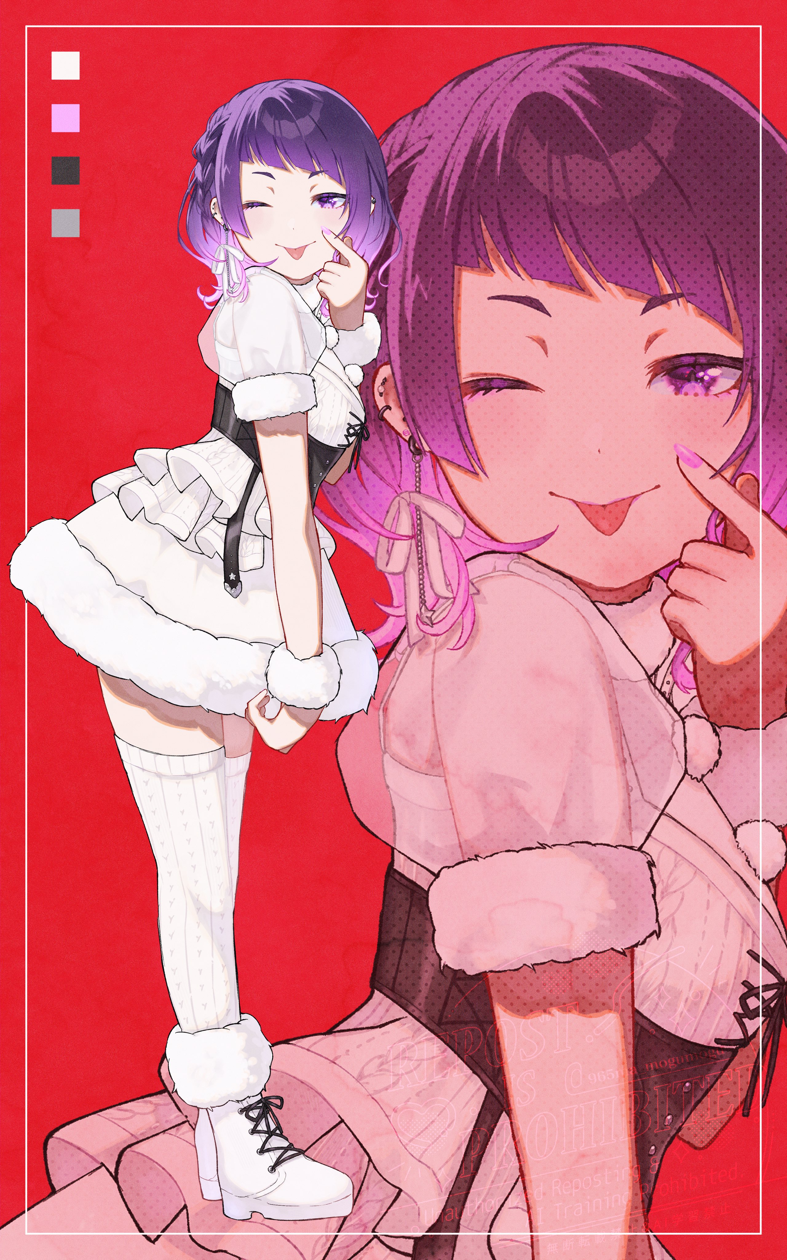 1girl 965ma_mogumogu absurdres akanbe alternate_hairstyle black_corset boots braid color_guide corset crown_braid diagonal_bangs dot_nose dress ear_piercing earrings eyelashes eyelid_pull fur-trimmed_boots fur-trimmed_dress fur-trimmed_sleeves fur_collar fur_trim fur_wrist_cuffs gradient_hair hair_ribbon highres idolmaster idolmaster_shiny_colors jewelry layered_dress looking_at_viewer multicolored_hair official_alternate_costume official_alternate_hairstyle one_eye_closed piercing pink_nails pom_pom_(clothes) puffy_short_sleeves puffy_sleeves purple_eyes purple_hair red_background ribbon see-through_clothes see-through_sleeves short_eyebrows short_sleeves smile solo star_(symbol) star_earrings tanaka_mamimi thighhighs tongue tongue_out underbust white_dress white_ribbon white_thighhighs wrist_cuffs zettai_ryouiki zoom_layer