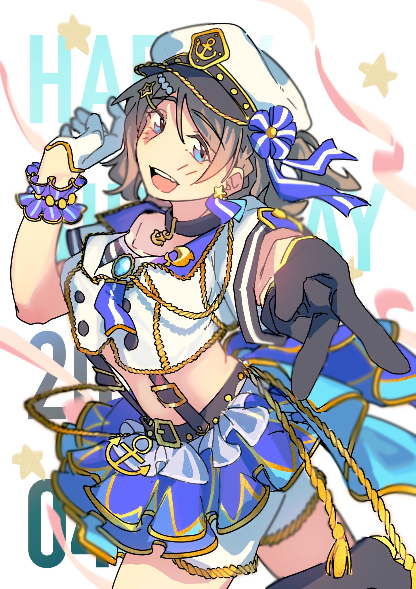 1girl 8ee76jknffwexba blue_eyes brown_hair english_text grey_hair happy_birthday hat highres looking_at_viewer love_live! love_live!_sunshine!! midriff miracle_voyage_(love_live!) navel open_mouth simple_background smile solo stomach thighs v watanabe_you