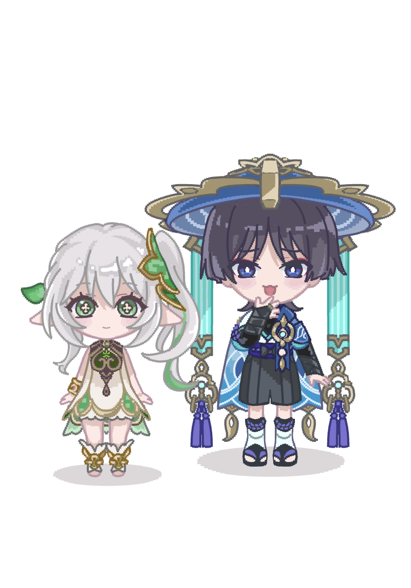 1boy 1girl :3 anklet armor arms_at_sides artistic_error black_bow black_bridal_gauntlets black_leggings black_sandals black_shorts bloomers blue_hat blue_kimono blue_sleeves blunt_ends blush_stickers bow bracelet bridal_gauntlets bright_pupils cape chibi choppy_bangs closed_mouth cross-shaped_pupils dress eyelashes eyeliner eyeshadow full_body furisode genshin_impact gold gold_ring green_cape green_eyes green_hair hair_between_eyes hair_ornament hakama hakama_shorts han'eri hand_up hat japanese_armor japanese_clothes jewelry jingasa kimono kote kurokote layered_kimono layered_sleeves leaf leaf_hair_ornament leg_warmers leggings long_hair looking_at_viewer makeup middle_ring multicolored_hair nahida_(genshin_impact) nanny_(199269) open_clothes open_hand open_kimono open_mouth pixel_art pleated_shorts purple_eyes purple_rope purple_sash red_eyeliner red_eyeshadow rope sandals sash scaramouche_(genshin_impact) short_sleeves shorts side_ponytail sidelocks smile smug socks standing streaked_hair symbol-shaped_pupils tareme tassel toeless_socks underwear wanderer_(genshin_impact) white_bloomers white_dress white_hair white_kimono white_leg_warmers white_pupils white_sleeves white_socks zouri