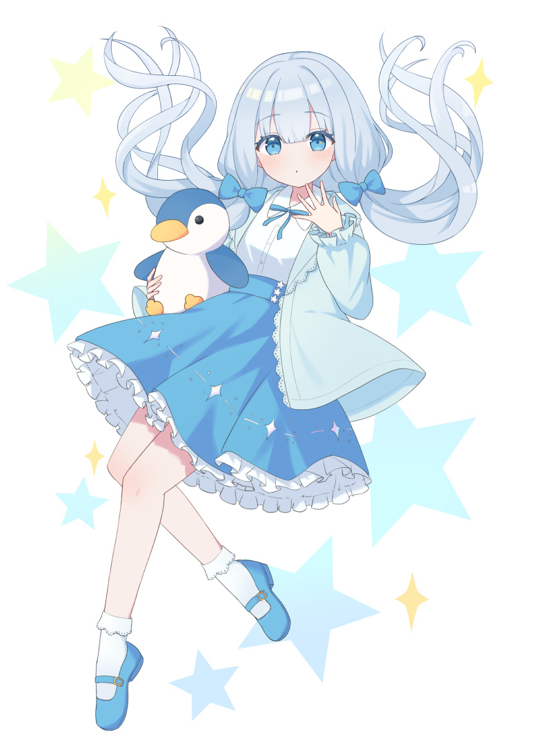1girl blue_bow blue_eyes blue_ribbon blue_shoes blue_skirt bow frilled_jacket frilled_skirt frilled_socks frills full_body furutori hair_bow high-waist_skirt holding holding_stuffed_toy jacket long_hair looking_at_viewer low_twintails mary_janes neck_ribbon open_clothes open_jacket original parted_lips ribbon shirt shoes skirt socks solo sparkle star_(symbol) star_symbol_background stuffed_animal stuffed_penguin stuffed_toy twintails very_long_hair white_background white_hair white_jacket white_shirt white_socks