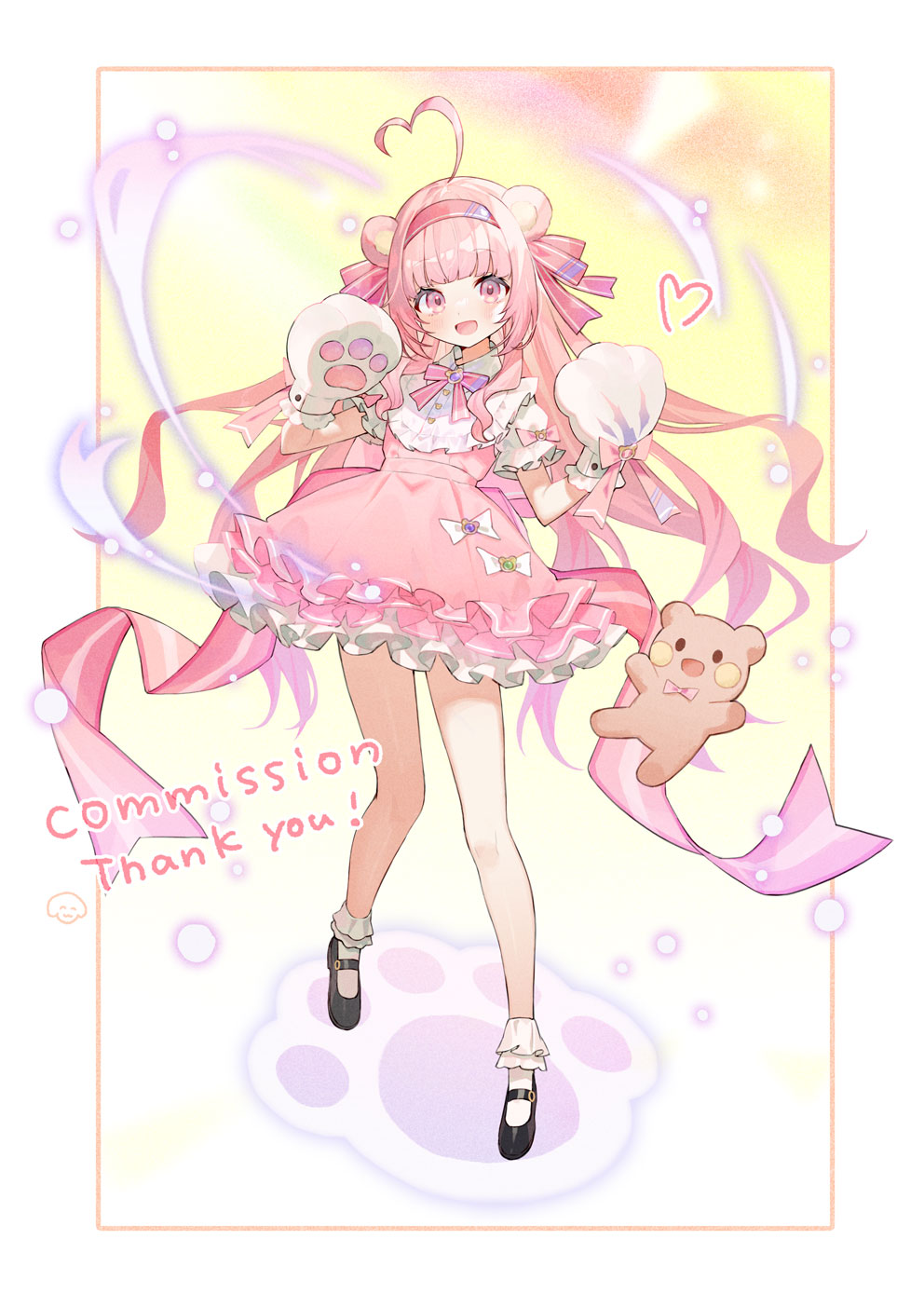1girl ahoge animal_hands commentary commission dress full_body gloves hair_ribbon hairband highres hiiro_kuma indie_virtual_youtuber long_hair mi_inunokao paw_gloves pink_dress pink_hair pink_hairband pink_ribbon puffy_sleeves ribbon shorts skeb_commission solo white_shorts
