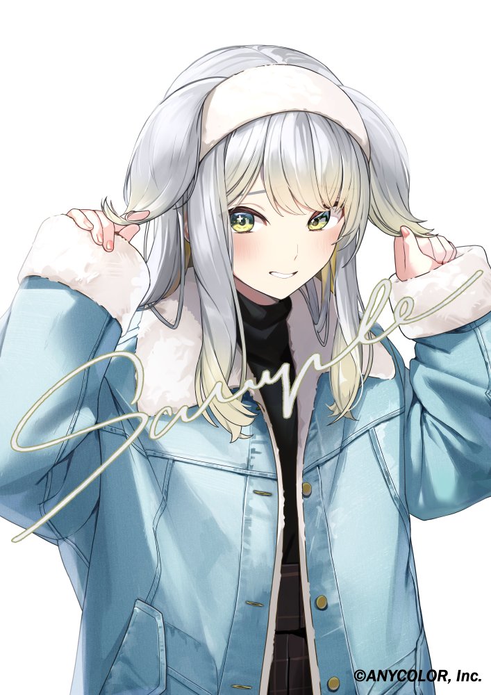 1girl animal_ears black_pants black_sweater blonde_hair blue_jacket blush buttons colored_inner_hair commentary_request company_name copyright_notice dog_ears dog_girl fur-trimmed_jacket fur-trimmed_sleeves fur_hairband fur_trim gradient_hair green_eyes grey_hair hairband hands_up high-waist_pants holding_own_ears jacket kagawa_ichigo long_hair long_sleeves looking_at_viewer multicolored_hair nijisanji official_art open_clothes open_jacket pants parted_lips raised_eyebrows sample_watermark shioriha_ruri sidelocks simple_background sleeves_past_wrists smile solo sweater turtleneck turtleneck_sweater upper_body virtual_youtuber watermark white_background white_hairband