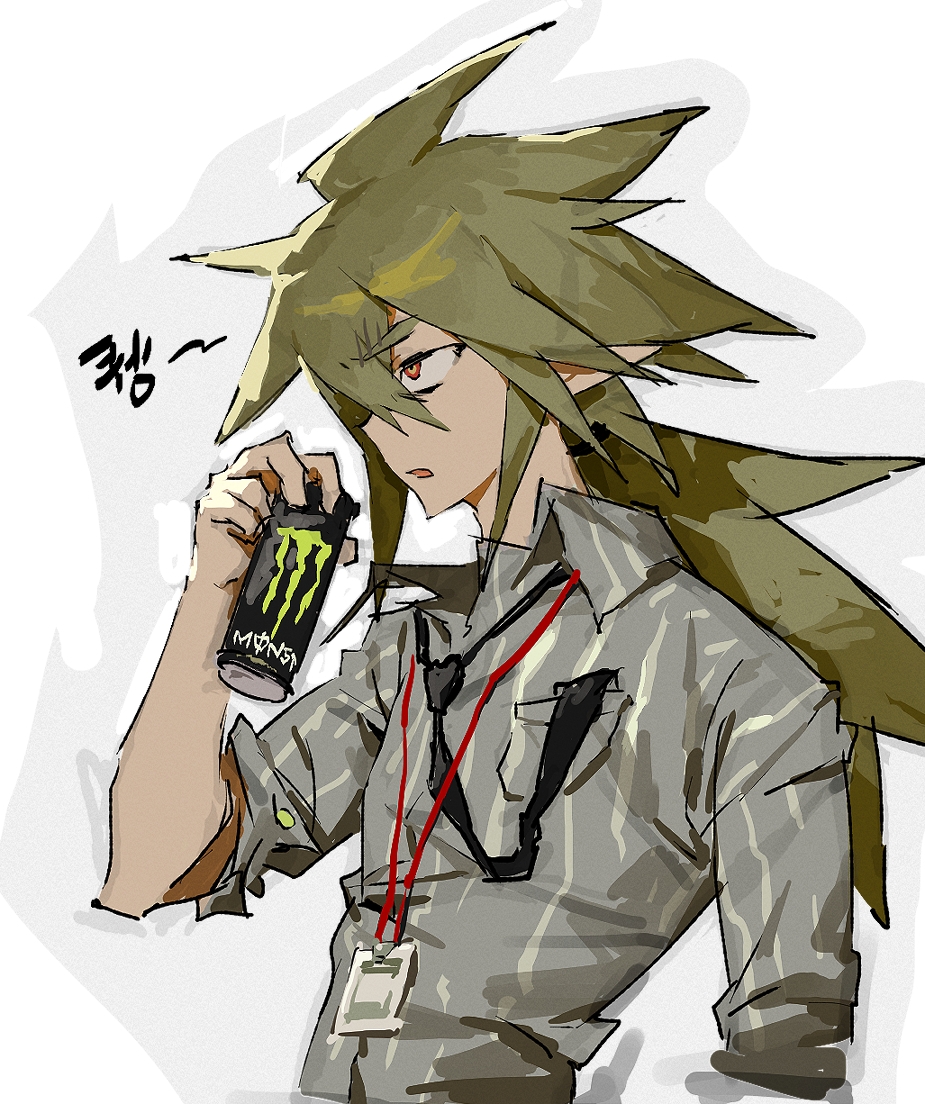1boy alternate_costume aotu_world black_necktie breast_pocket can collared_shirt drink_can energy_drink green_hair grey_shirt hair_between_eyes hand_up holding holding_can id_card korean_text lanyard long_hair low_ponytail male_focus monster_energy necktie open_mouth peong22 pocket pointy_ears ponytail red_eyes shirt simple_background sketch sleeves_rolled_up soda_can solo spiked_hair upper_body white_background xander_(aotu_world)