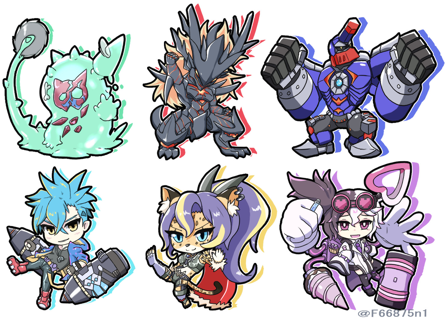 2girls 3boys armor black_shirt blonde_hair blue_armor blue_hair blue_jacket chibi coat dragon duel_monster furry furry_female goggles goggles_on_head group_picture high_ponytail jacket lab_coat long_hair mecha multicolored_hair multiple_boys multiple_girls ponytail robot shirt shoku_(nemurito) short_hair slime_(creature) streaked_hair twintails two-tone_hair vanquish_soul_caesar_valius vanquish_soul_dr._mad_love vanquish_soul_heavy_borger vanquish_soul_pantera vanquish_soul_pluton_hg vanquish_soul_razen white_coat yu-gi-oh!