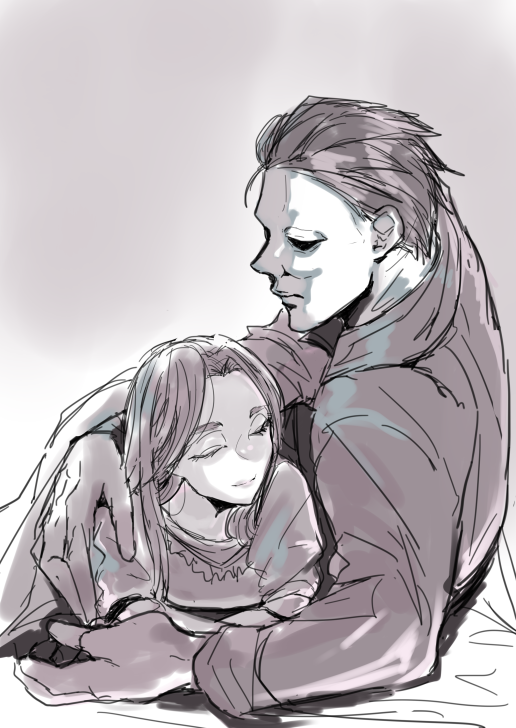 1boy 1girl 1kouj1_yaeko 2019 age_difference brown_hair halloween_(movie) height_difference hug jamie_lloyd michael_myers monochrome older_male_and_younger_female size_difference uncle_and_niece white_mask