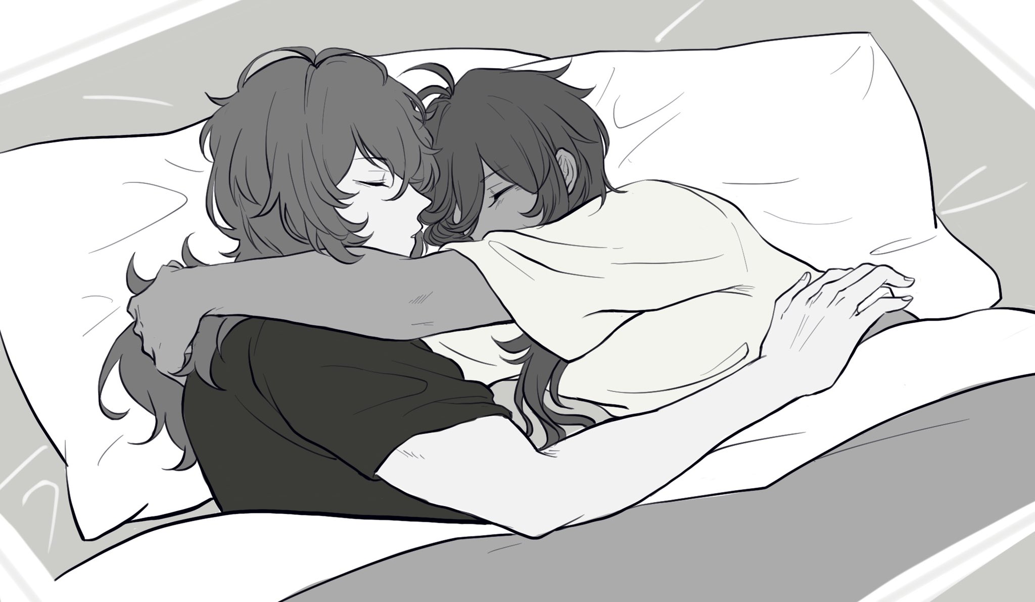 2boys aff74657844 arms_around_neck closed_eyes commentary dark-skinned_male dark_skin diluc_(genshin_impact) genshin_impact greyscale highres kaeya_(genshin_impact) long_hair lying male_focus monochrome multiple_boys on_side pillow ponytail shirt short_sleeves sleeping t-shirt under_covers yaoi