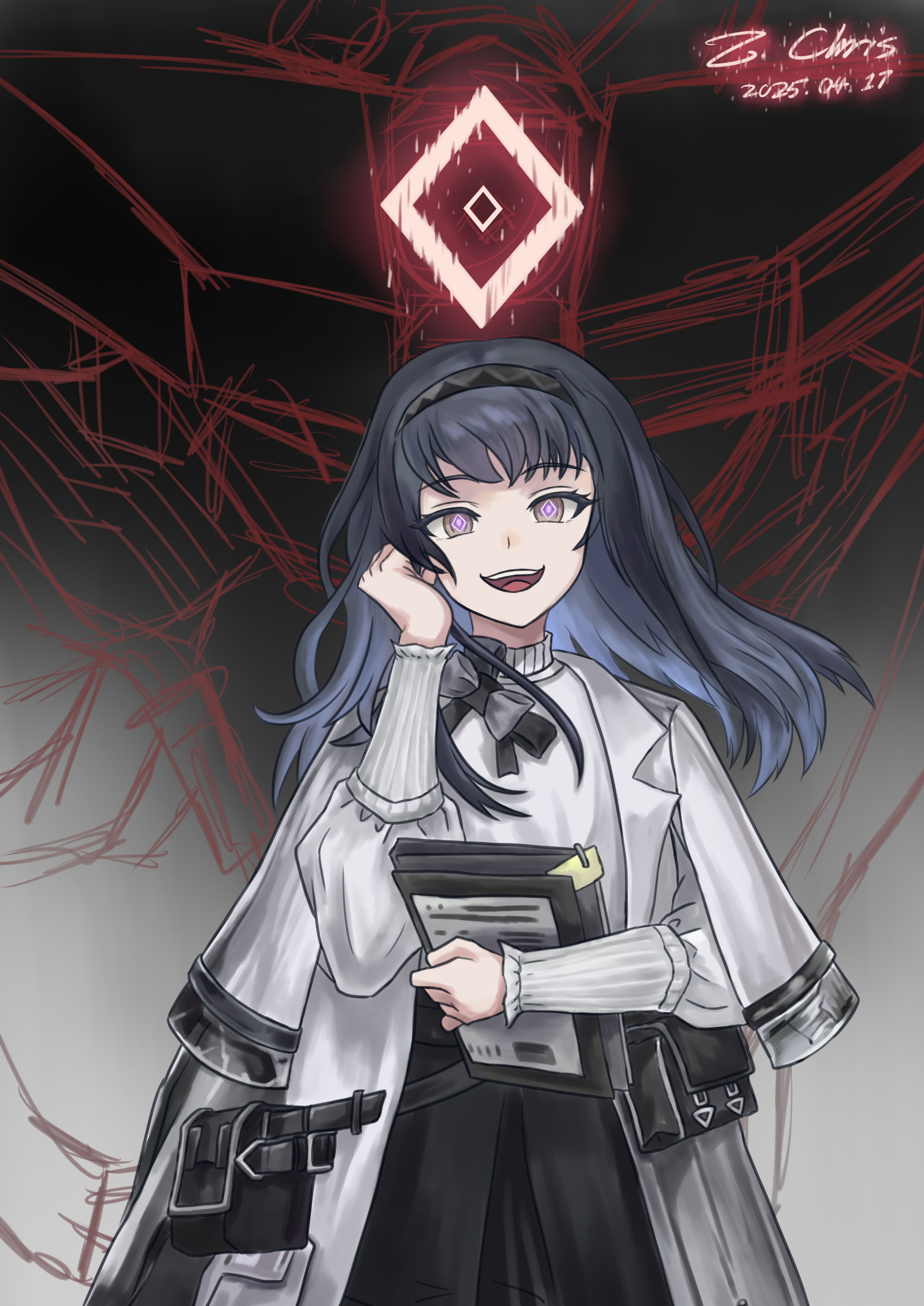 1girl :d absurdres arknights arm_up artist_name black_hair black_hairband blue_hair chinese_commentary coat commentary commentary_request cowboy_shot dated english_commentary gradient_hair grey_eyes hairband halo hand_in_own_hair highres holding lab_coat long_sleeves looking_at_viewer medium_hair mixed-language_commentary multicolored_hair open_mouth partial_commentary pouch priestess_(arknights) purple_pupils red_halo smile solo standing sweater teeth turtleneck turtleneck_sweater upper_teeth_only white_coat white_sweater z_.chris