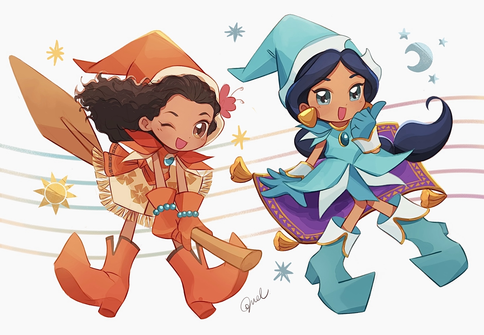 2girls adapted_costume aladdin_(movie) black_hair broom broom_riding brown_eyes brown_hair company_name cosplay curly_hair dark-skinned_female dark_skin earrings highres jasmine_(disney) jewelry long_hair looking_at_viewer melchencanto moana_(movie) moana_waialiki multiple_girls ojamajo_doremi parody smile very_long_hair