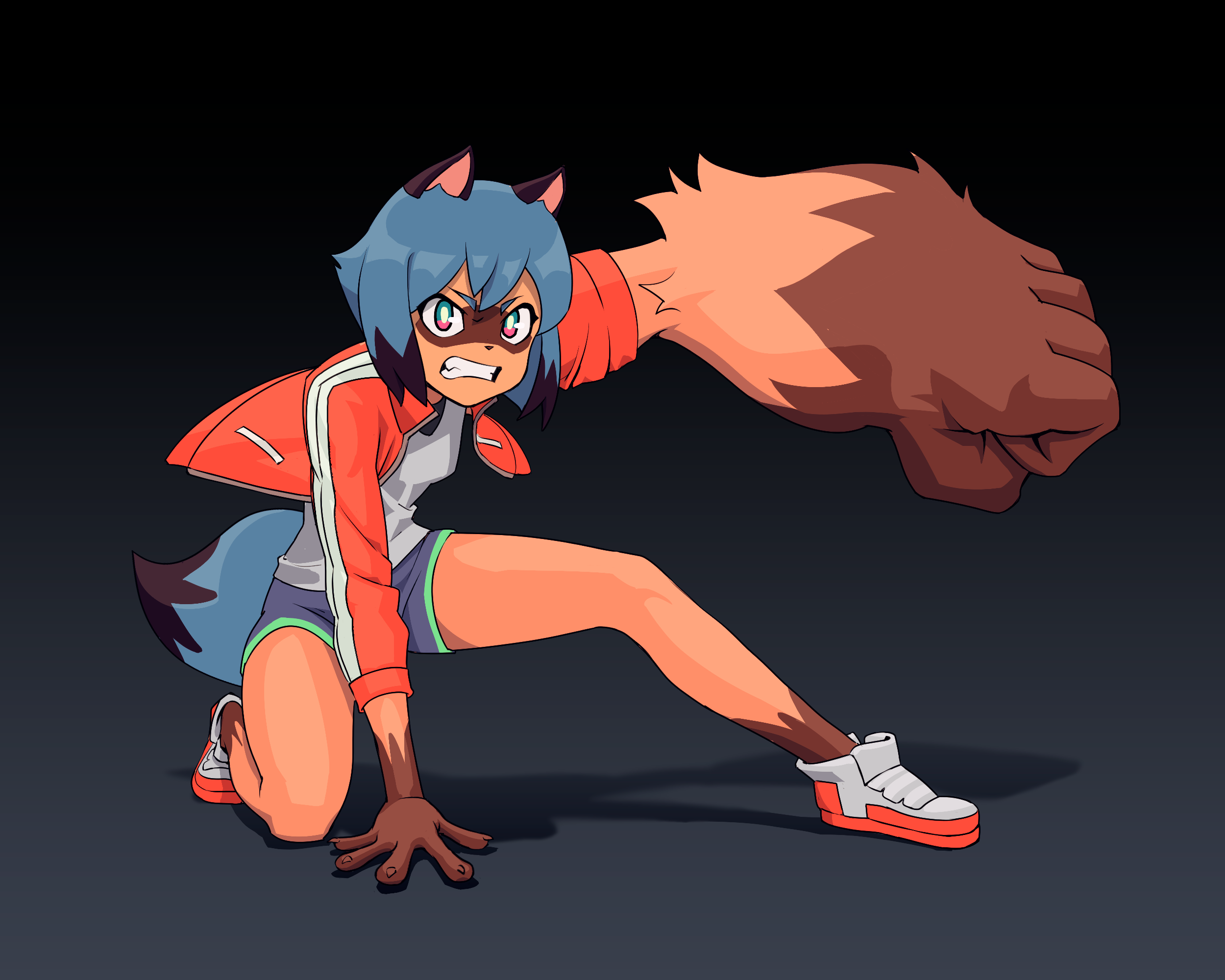 1girl animal_ears blue_hair blue_shorts brand_new_animal clenched_teeth emiladylbekuulu gorilla_arm highres jacket kagemori_michiru non-web_source raccoon_ears raccoon_girl raccoon_tail red_jacket shoes shorts trigger_(company) tail tanuki teeth trigger_(company)