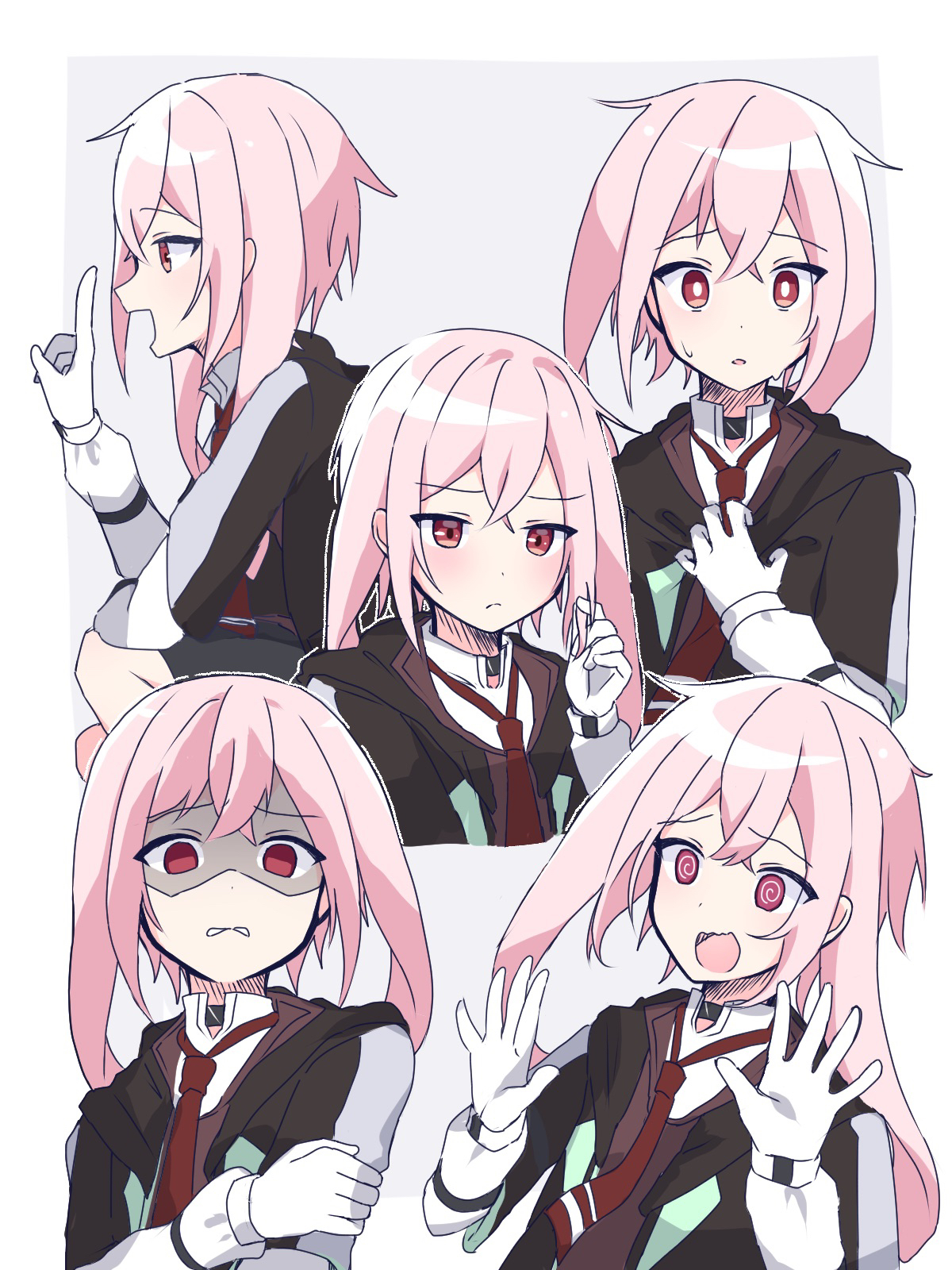 1boy @_@ ansel_(arknights) arknights black_jacket blush border brown_vest closed_mouth commentary_request crossed_bangs disgust gloves grey_background hand_in_own_hair hand_on_own_arm hand_up highres index_finger_raised jacket long_hair long_sleeves looking_ahead looking_at_viewer male_focus multiple_expressions multiple_views necktie nervous no_(gesture) no_pupils open_mouth outside_border parted_lips pink_eyes pink_hair profile red_eyes red_necktie sakusan_kurozu shaded_face shirt smile split_mouth sweatdrop vest white_border white_gloves white_shirt