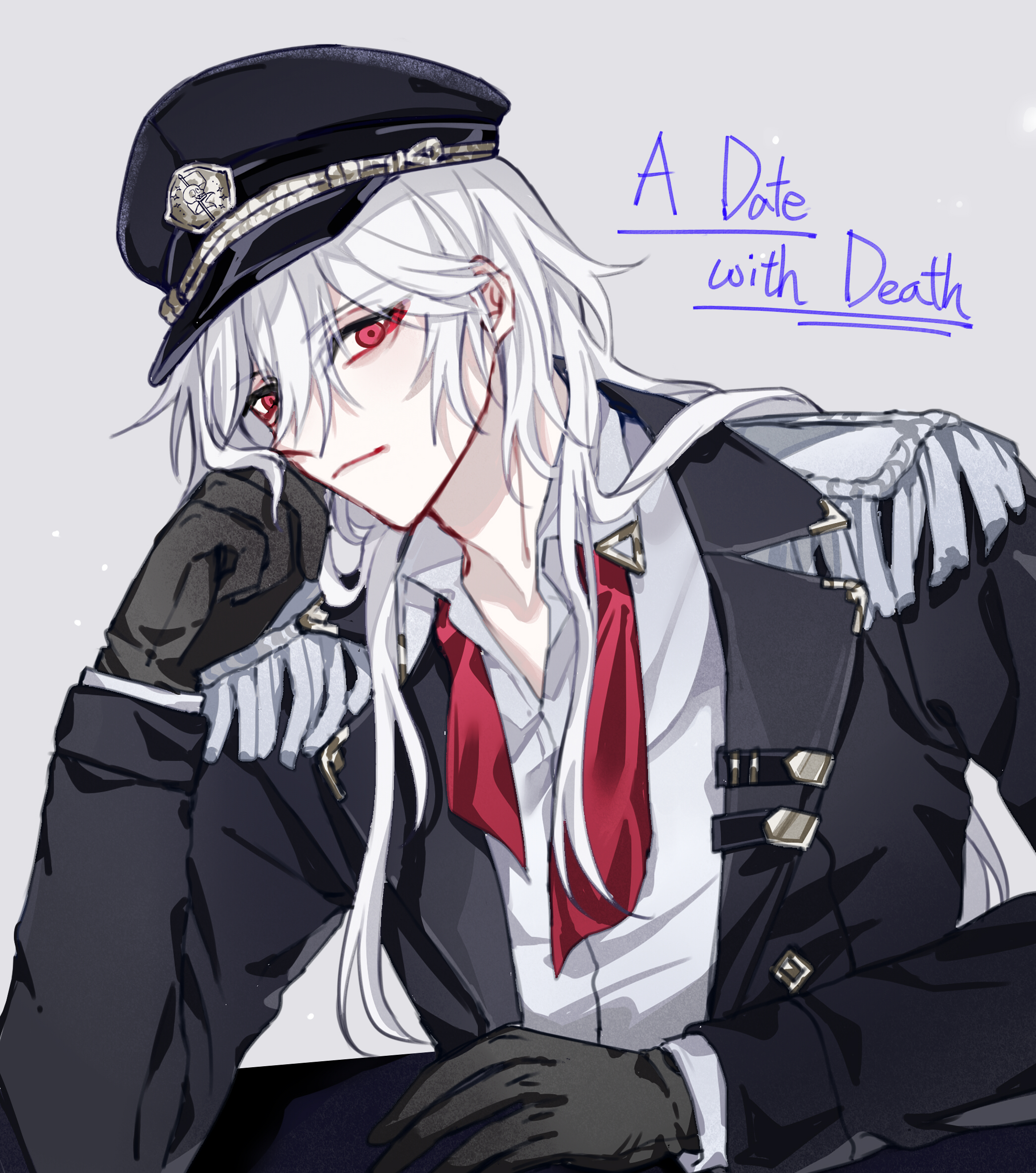 1boy a_date_with_death ascot black_gloves casper_(a_date_with_death) copyright_name gloves grey_background hair_between_eyes hat highres long_hair long_sleeves looking_at_viewer male_focus military_hat military_uniform peaked_cap red_ascot red_eyes sanfangzhu58831 shirt simple_background solo upper_body white_hair white_shirt