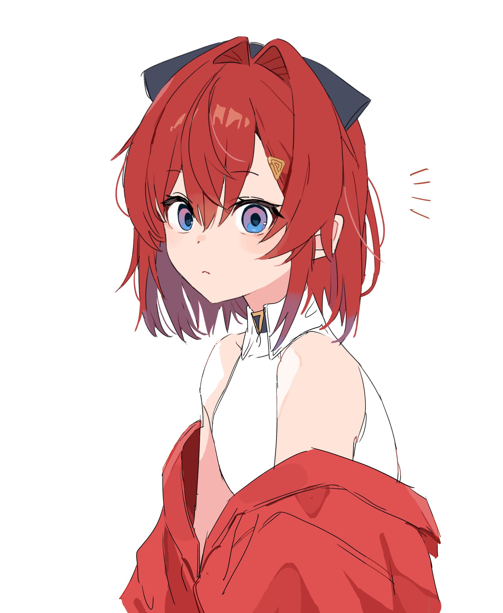 1girl ange_katrina ange_katrina_(summer_casual) bare_shoulders black_bow blue_eyes bow closed_mouth collared_shirt flat_chest from_side gradient_eyes hair_between_eyes hair_bow hair_intakes hair_ornament happachan2do6 hashtag-only_commentary highres jacket light_frown long_bangs looking_at_viewer medium_hair multicolored_eyes nijisanji notice_lines off_shoulder purple_eyes red_hair red_jacket shirt simple_background sleeveless sleeveless_shirt solo triangle_hair_ornament upper_body virtual_youtuber white_background white_shirt