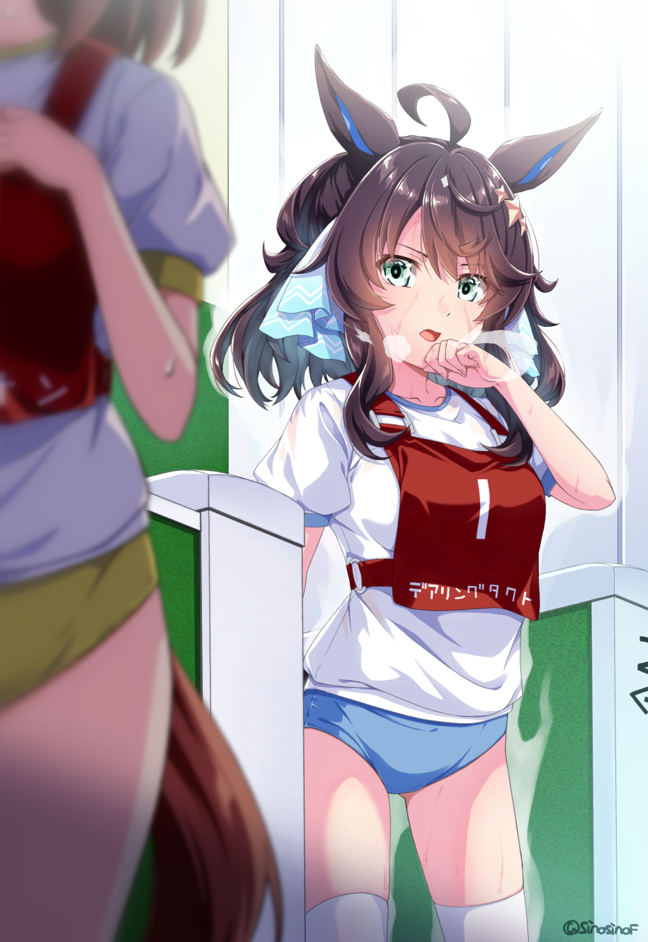 2girls ahoge animal_ears black_hair blue_eyes blush breasts buruma commission daring_tact_(umamusume) hair_ornament heavy_breathing highres horse_ears horse_girl long_hair looking_at_viewer medium_breasts multiple_girls open_mouth scene_reference shinohara_shinome skeb_commission solo_focus star_(symbol) star_hair_ornament steaming_body sweat thighhighs twitter_username umamusume