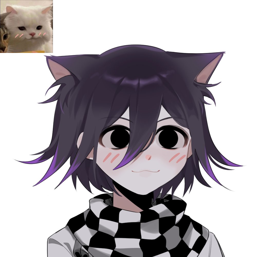 1boy :3 animal_ear_fluff animal_ears black_eyes black_hair blush cat cat_boy cat_ears checkered_clothes checkered_scarf commentary danganronpa_(series) danganronpa_v3:_killing_harmony dilated_pupils flipped_hair hair_between_eyes looking_at_viewer male_focus medium_hair oma_kokichi photo_inset portrait purple_hair reference_inset scarf simple_background solo songpyeon_(sssssong) two-tone_scarf white_background