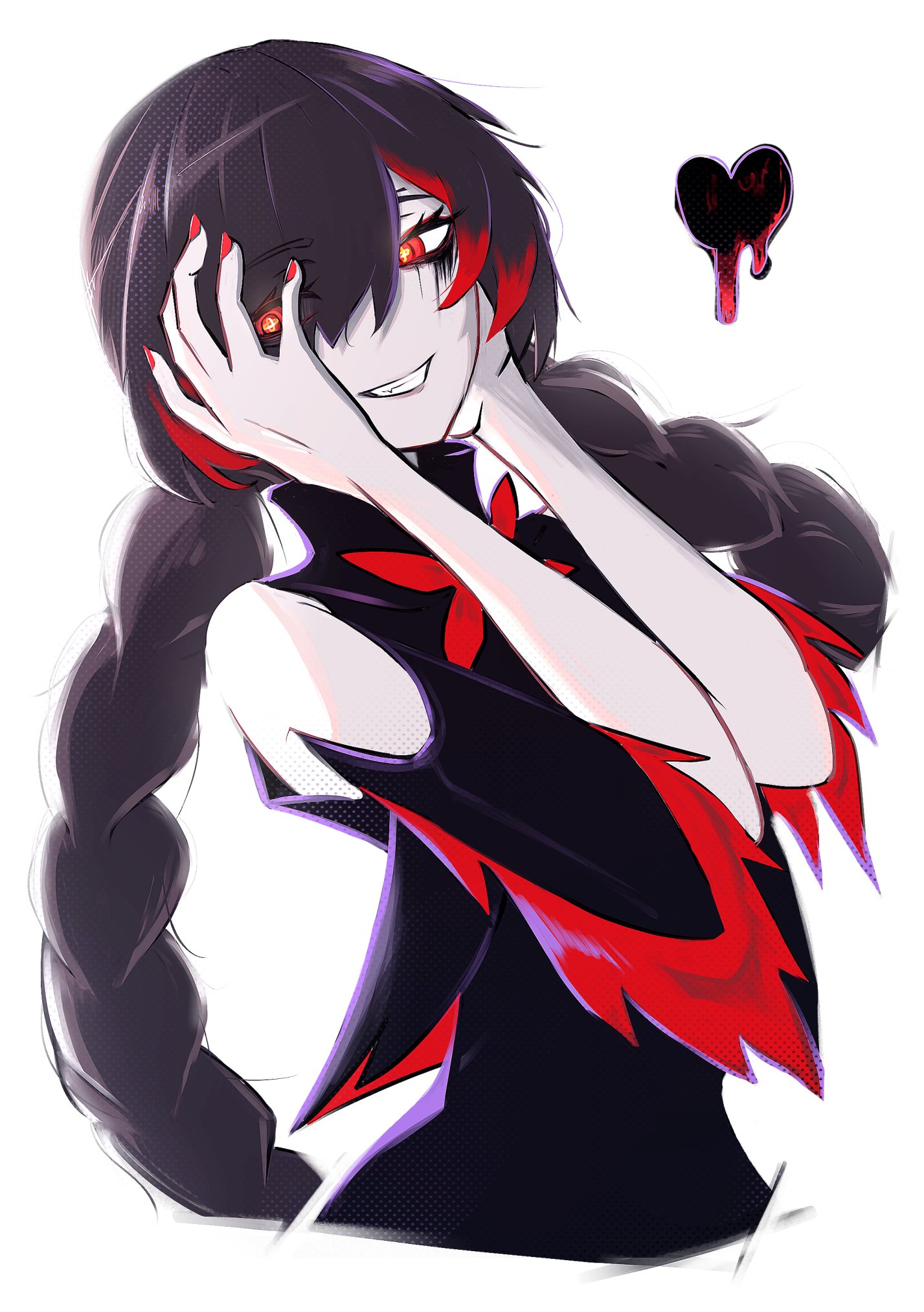 1girl black_dress black_hair braid clothing_cutout cradle_(pgr) dress grin hair_over_one_eye hands_on_own_head highres looking_at_viewer magic_circle pale_skin punishing:_gray_raven red_eyes red_nails red_streaks shoulder_cutout smile solo symbol-shaped_pupils twin_braids white_background yukiharuorent