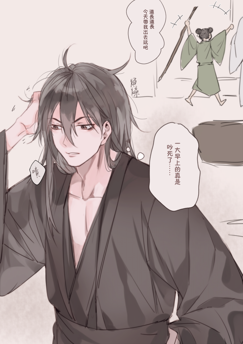 1girl 2boys a-qing black_hair brown_eyes cane chinese_clothes chinese_commentary ddela double_bun green_hanfu hair_bun hair_down hand_on_own_head hand_on_own_hip hanfu highres holding holding_cane indoors long_hair looking_down modao_zushi motion_lines multiple_boys scratching_head speech_bubble thought_bubble upper_body white_hanfu xiao_xingchen xue_yang