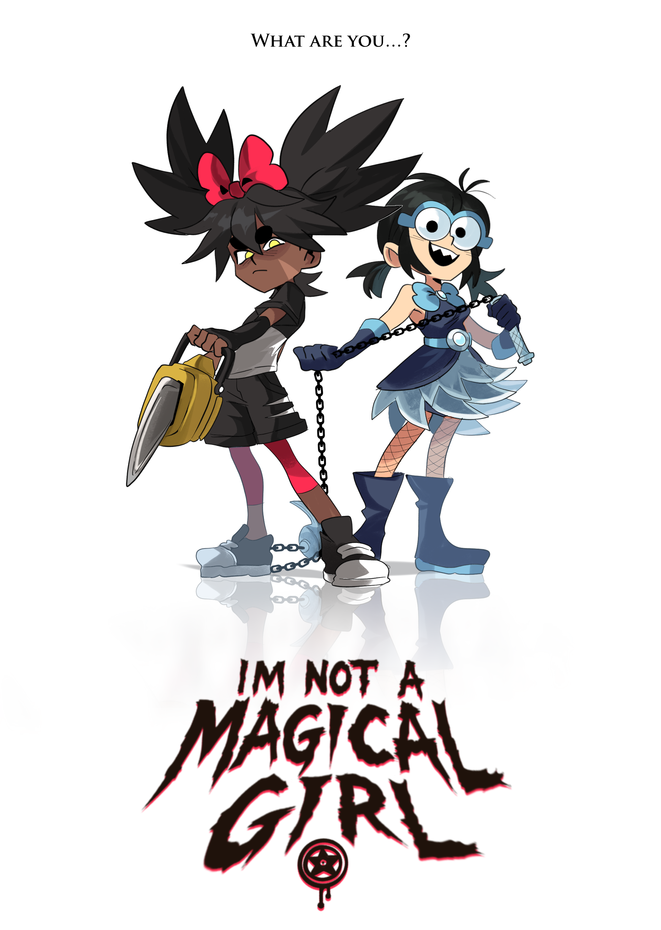 2girls absurdres belt black_hair boots bow cassie_su chain chainsaw dark-skinned_female dark_skin dress fishnet_pantyhose fishnets glasses highres i'm_not_a_magical_girl leggings low_twintails lulu_kasuko magical_girl marnie_(marnielovesyou) multiple_girls original pale_skin pantyhose scar scar_on_face sharp_teeth shoes short_twintails shorts sneakers teeth twintails very_dark_skin yellow_eyes