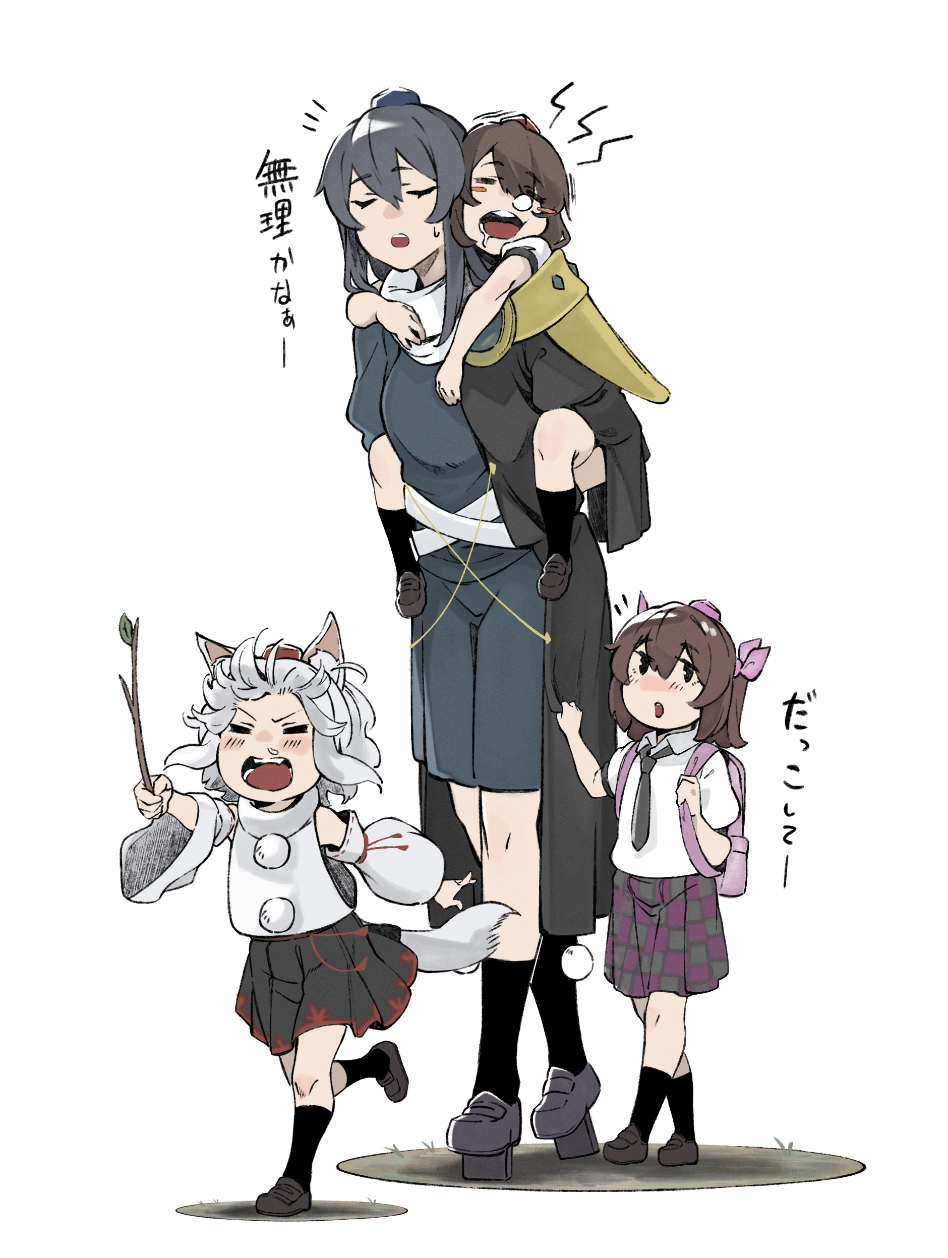 4girls absurdres aged_down animal_ears black_coat black_hair black_necktie blue_dress brown_hair carrying checkered_clothes checkered_skirt closed_eyes coat collared_shirt dress hair_between_eyes hat highres himekaidou_hatate holding iizunamaru_megumu inubashiri_momiji long_hair multiple_girls necktie open_mouth piggyback pleated_skirt pom_pom_(clothes) purple_skirt shameimaru_aya shirt short_hair short_sleeves shot_(shot0598) shoulder_guard skirt sleeveless stick tail tengu_family_of_gensokyo_(touhou) token_hat tokin_hat touhou translation_request twintails white_hair white_shirt wolf_ears wolf_tail