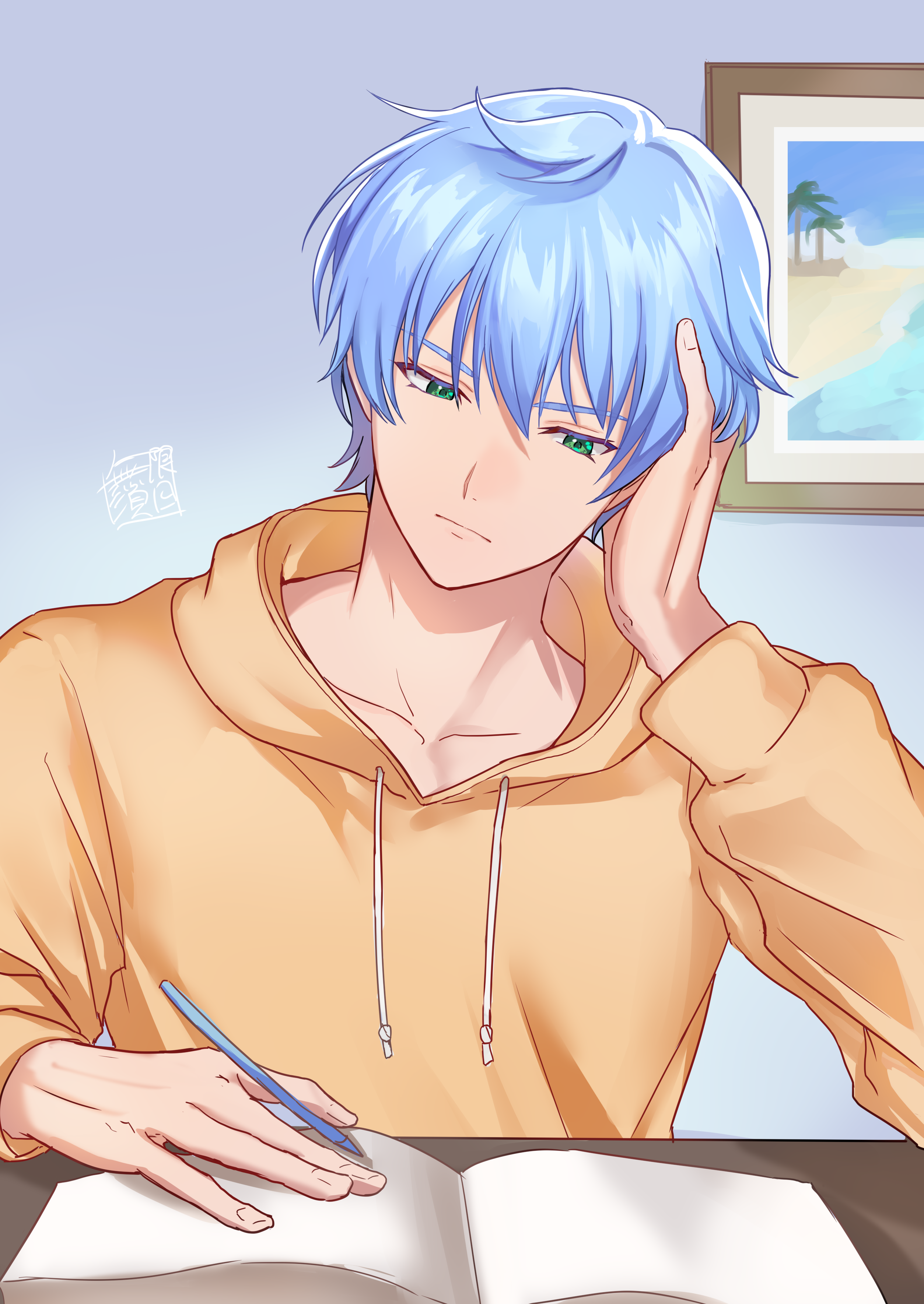 1boy absurdres blue_hair book commentary_request drawstring green_eyes hand_on_own_head highres himuro_inori holding holding_pen hood hoodie looking_down male_focus mugen_no_sudadokei open_book pen picture_frame reading signature solo studying thinking tokimeki_memorial tokimeki_memorial_girl's_side tokimeki_memorial_girl's_side_4th_heart