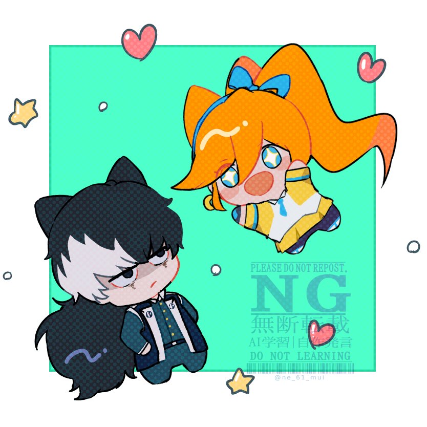 1boy 1girl ace_attorney athena_cykes black_eyes black_hair black_jacket black_pants blue_bow blue_eyes blue_necktie bow chibi chibi_only closed_mouth crescent crescent_earrings earrings hair_between_eyes hair_bow heart jacket jewelry long_hair looking_at_another multicolored_hair necktie nemui61 open_mouth orange_hair pants shirt side_ponytail simon_blackquill skirt star-shaped_pupils star_(symbol) symbol-shaped_pupils twitter_username two-tone_hair very_long_hair white_hair white_shirt yellow_jacket yellow_skirt